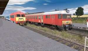 A Ganz MDmot leaves a station at the countryside.