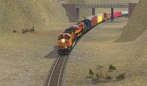A BNSF Manifest running up a steep gradient with an Ex-CSX PRLX SD70M Unit trailling.