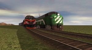 As BN Test Train waits, a Ashley freight rushs pass with two Ashley CF7s.