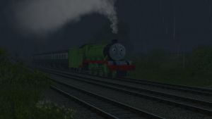 Rosie pulls a passenger train in a bad storm