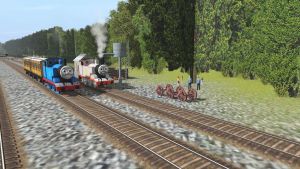 edward the blue einge is saying hello to thomas brother timothy as edward is taking a passenger train on the main line.