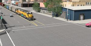 A UP Local Frieght makes its way down 9th Street in Modesto CA on March 26th, 1999.