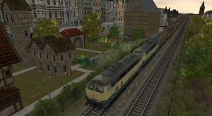 A pair of DB218 locos pull a rattly train of empties past the ornamental garden in the old town of Scutzenberg.