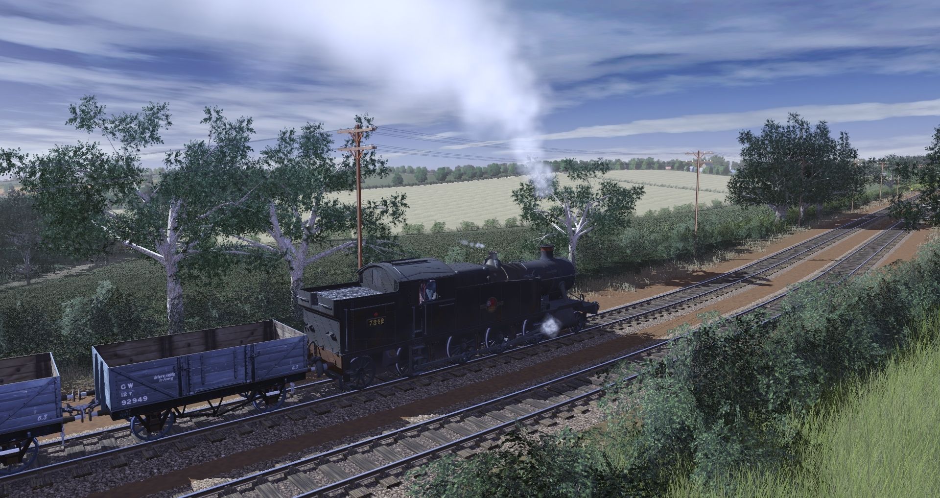 Tags: Trainz Railroad Simulator 2019, 1930s Cornish Mainline and Branches - Plymouth to Penzance, Default, BR ex GWR 7200 class, GWR 1366 class, GWR 5 Plank w ACS 944, GWR 5 Plank w ACS 949, GWR 5-plank open with gravel load, GWR 6 plank w ACS, GWR 9 ton 16 foot van early detailed, GWR 13T Brake Van - Acton Depot, GWR 03992 7-plank wagon, GWR 67812 7-plank wagon, GWR (F. Bendle) 20T Mineral coal load