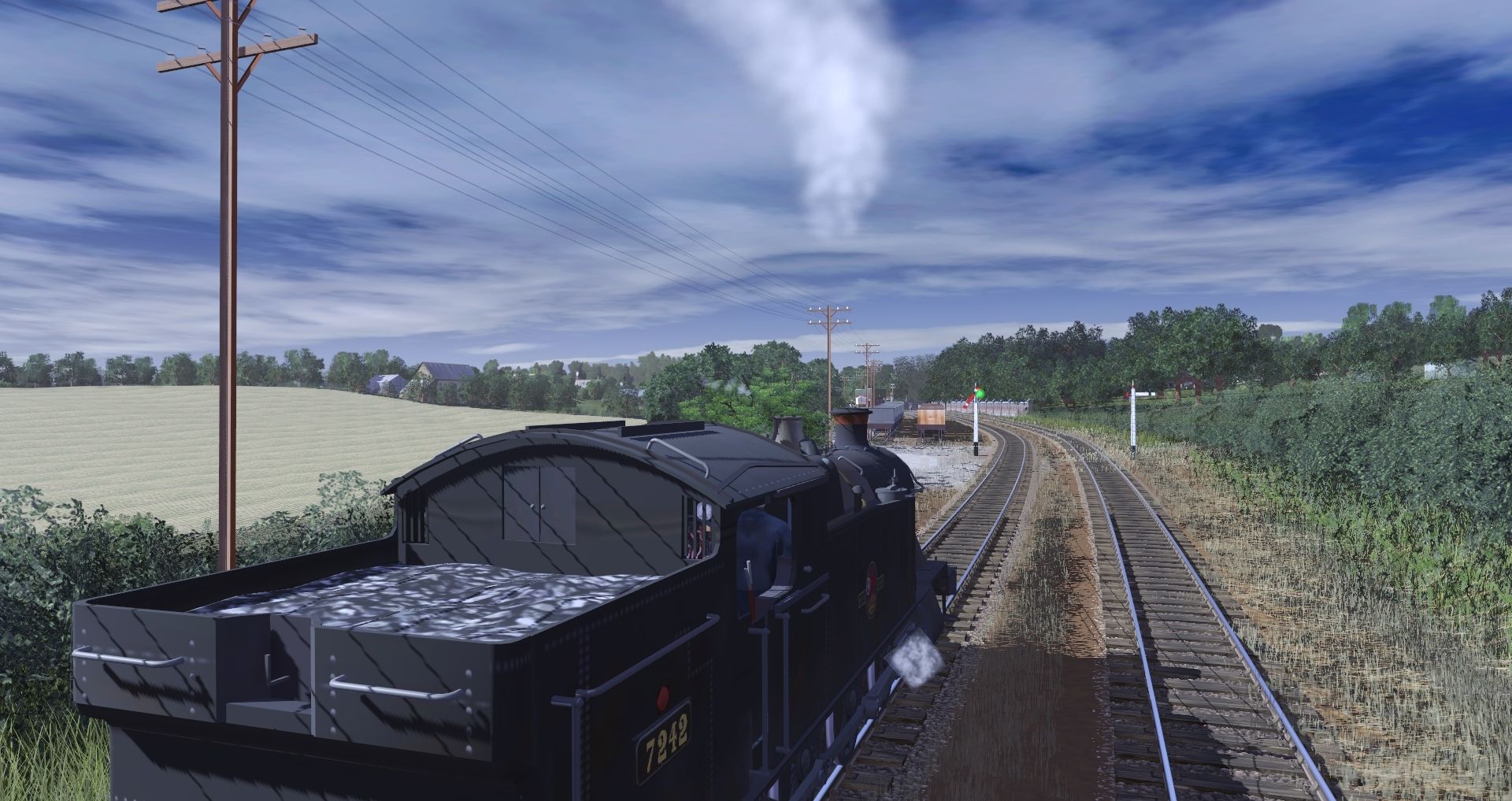 Tags: Trainz Railroad Simulator 2019, 1930s Cornish Mainline and Branches - Plymouth to Penzance, Default, BR ex GWR 7200 class, GWR 1366 class, Ivatt 2MT - BR Black, GWR 5 Plank w ACS 949, GWR 5 Plank w ACS 944, GWR 5-plank open with gravel load, GWR 6 plank w ACS, GWR 9 ton 16 foot van early detailed, GWR 13T Brake Van - Acton Depot, GWR 03992 7-plank wagon, GWR 67812 7-plank wagon