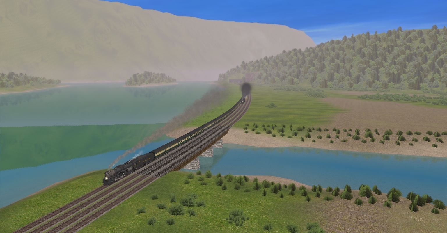 Tags: Trainz: A New Era, Happy Place RR, C&O 2765 Engine, UPRR FEF-3 8444, C&O 2765 Tender, Greenbrier Express Tool Car, Greenbrier Express Crew Car, Greenbrier Express Coach Lounge 1, Greenbrier Express Diner, Greenbrier Express Coach Lounge 2, UPRR FEF Black oil tender, UP Lightweight 1954 COSF Baggage 5704, up rpo 5900