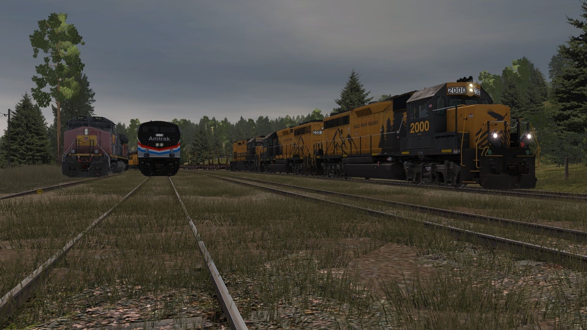 Tags: Trainz: A New Era, Eagle River Railway, lots of trains, AMTK P40DC Exhibit Train phIII, UP C44-9W Ex-SP Patched, ERSX GP15T 2020, BNSF C44-9W h3, ERSX GP40-2, Eagle River 06 Open Air Coach, ERSX 54ft flatcar, Eagle River 05 Super Dome, ERSX 60Ft.9In. woodchip gondola, ERSX Ce-11 Caboose (weathered)