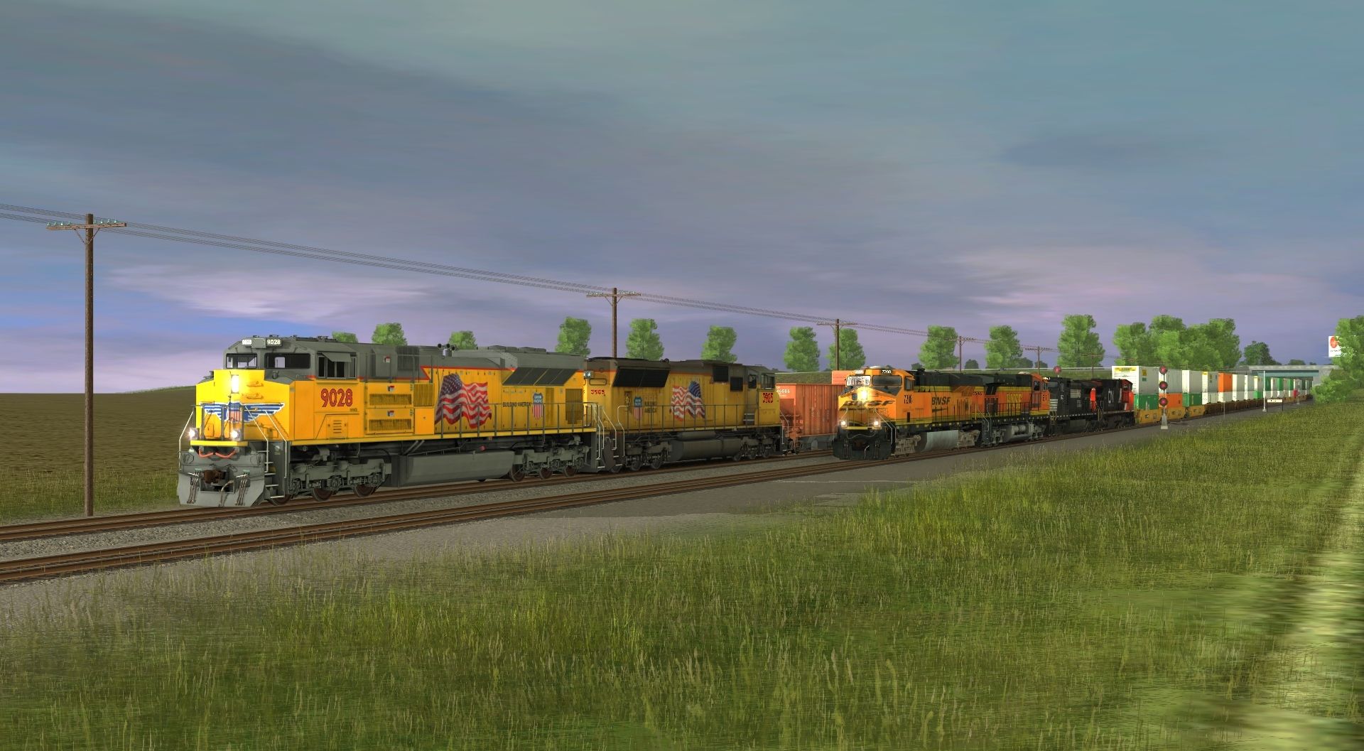 Tags: Trainz: A New Era, Midwest Grain 3.0 R1, UP SD70ACe (late), UP SD70M Flared Radiator Loco, BNSF ES44DC Dirty 1, BNSF H2 Dash 9-44CW, NS C40-9W, CN C44-9W 2523-2602, CC&W MOW 100 Ton Hopper, CC&W MOW 60' ACF Boxcar, CC&W MOW G72 Gondola, ERSX Ce-11 Caboose (weathered), TTX 53 Husky Stack