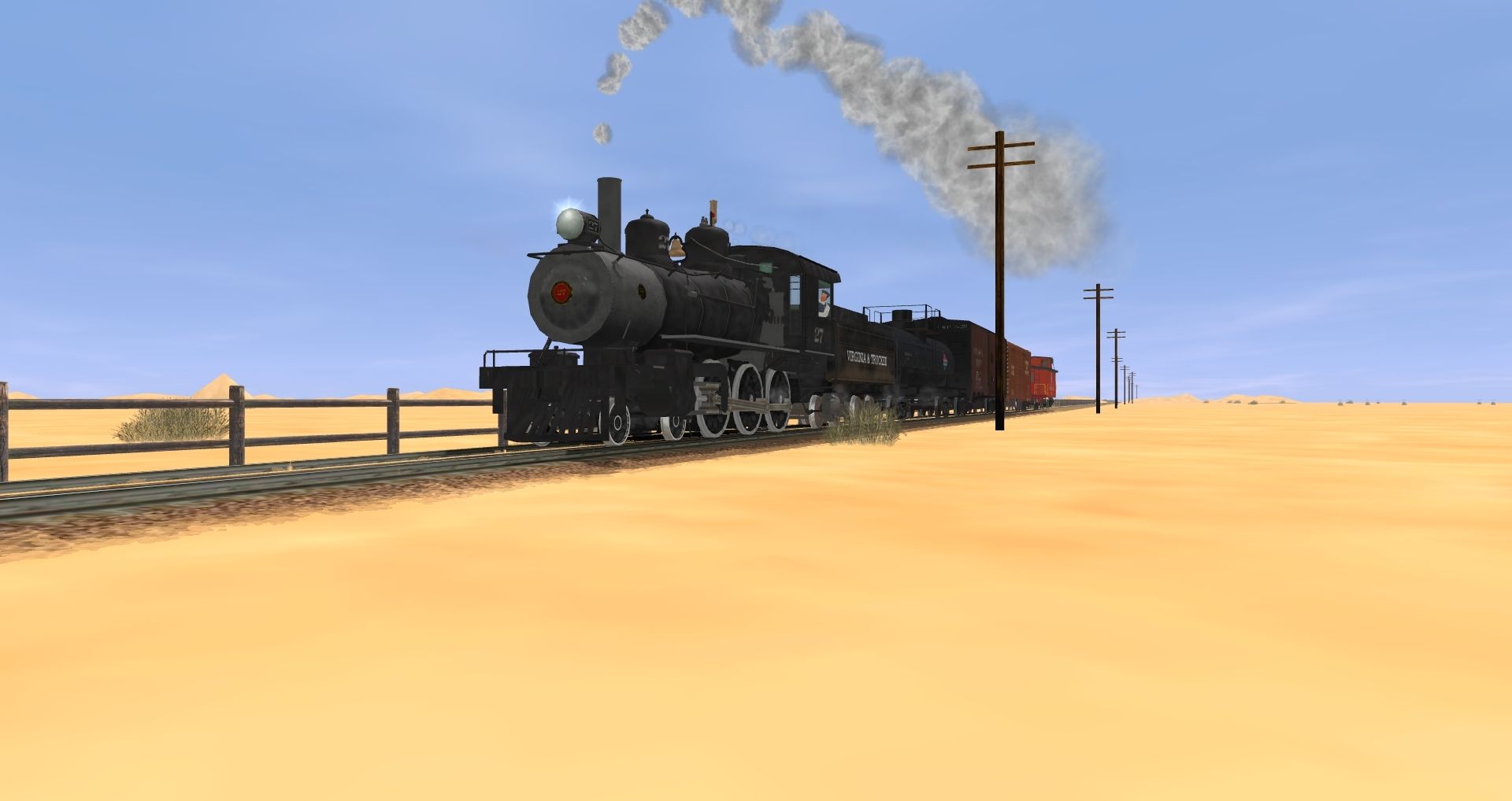 Tags: Trainz: A New Era, Desert Route, Default, V & T loco no 27 (steel cab), V & T loco No 27 tender, Standard Oil Tanker 1, 40ft Boxcar NKP, 40ft Boxcar NW 01, PRR FM flat car, Caboose C&O 90212 red