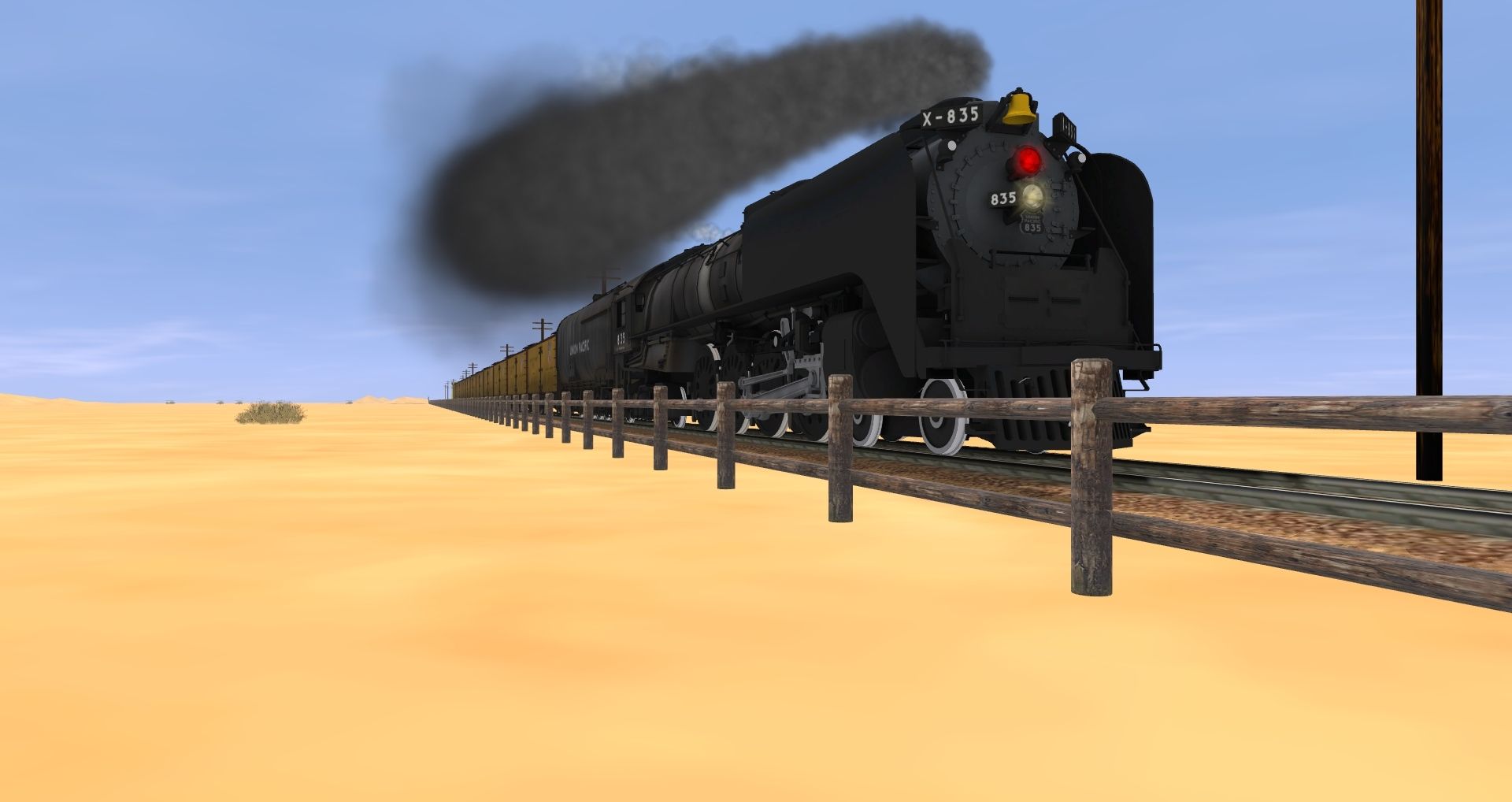 Tags: Trainz: A New Era, Desert Route, Default, UPRR FEF-3 835, UPRR FEF Black oil weatherd tender, PFE R-40-2 Reefer Early, Caboose C&O A907 yellow
