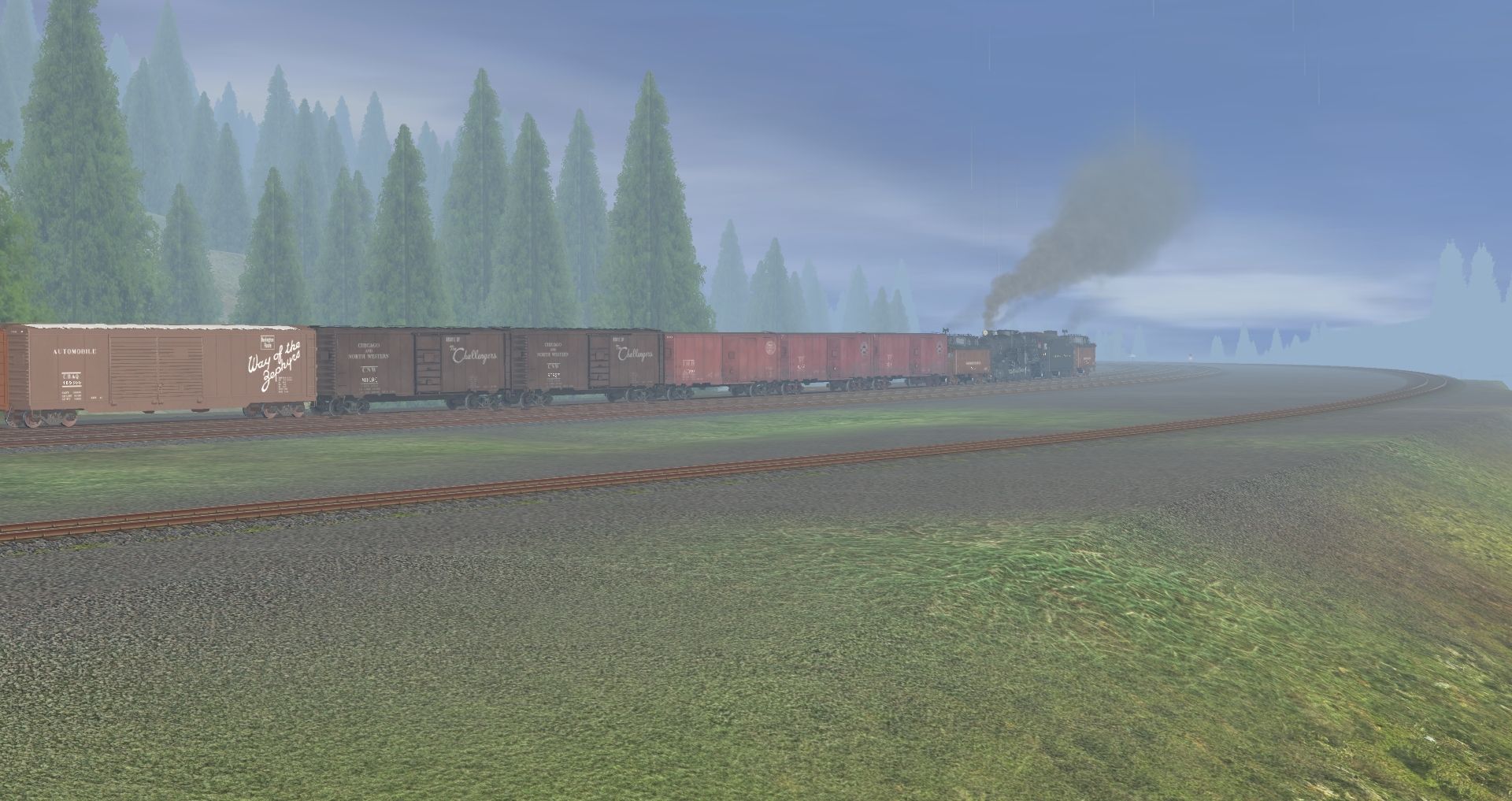 Tags: Trainz: A New Era, Marias Pass Route X, Marias Steam 1, PRR I1sa Engine Post-War, Great Northern class H-4 - Baldwin 1909, Medium 2-8-0 3-Digit Black, PRR M1b Engine, 40ft SP AAR boxcar, 40ft Southern AAR DD boxcar, 40ft Stockcar Great Northern #, 40ft NH(bk) AAR boxcar, 50ft CB&Q boxcar w/end doors, 40ft NH AAR boxcar, 40ft Boxcar CNW