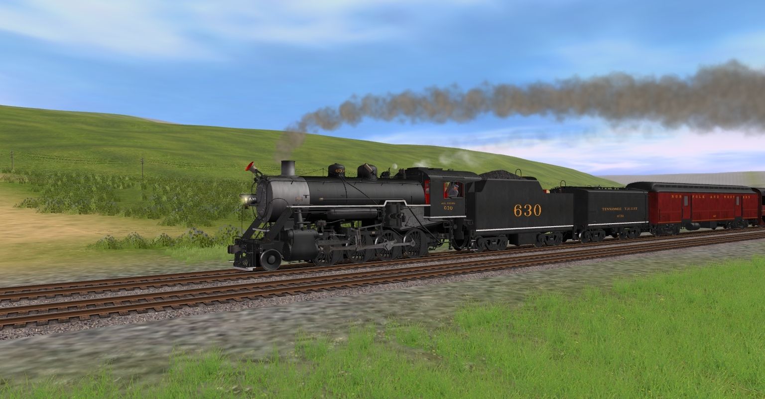 Tags: Trainz: A New Era, Happy Place RR, Southern 630 Engine, C&O Kanawha Engine, Southern 630 Tender, Southern 630 Aux Tender V1, N&W Tool Car #1407, TVRM Coach Lounge, Silver Coach, TVRM Coach Archroof, TVRM Tool Car 50, N&W NS Powhatan Arrow 03 P3 Standard Coach 535, Southern Coach Lounge