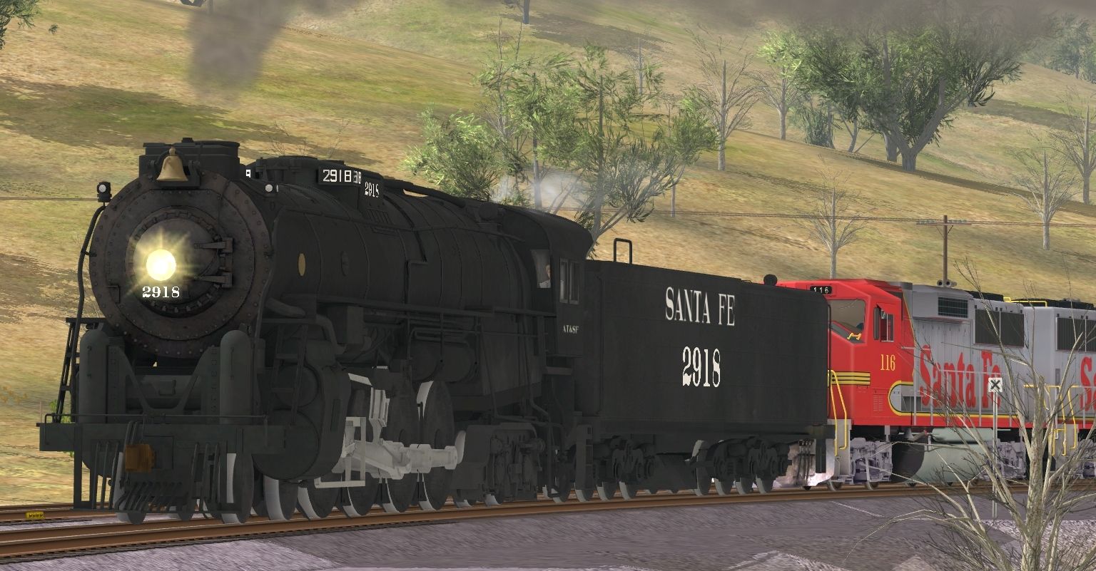 Tags: Trainz: A New Era, Mojave Sub Division, Mojave Sub Division - Default, Flying Cam, ATSF #2900 Class Northern (Black Smokebox), ATSF GP60M, ATSF #2900 Class Northern Tender, CB&Q California Zephyr - 905, CB&Q California Zephyr - 193, CB&Q California Zephyr - 424, CB&Q California Zephyr - 427, CB&Q California Zephyr - 452, CB&Q California Zephyr - 4720, CB&Q California Zephyr - 4719