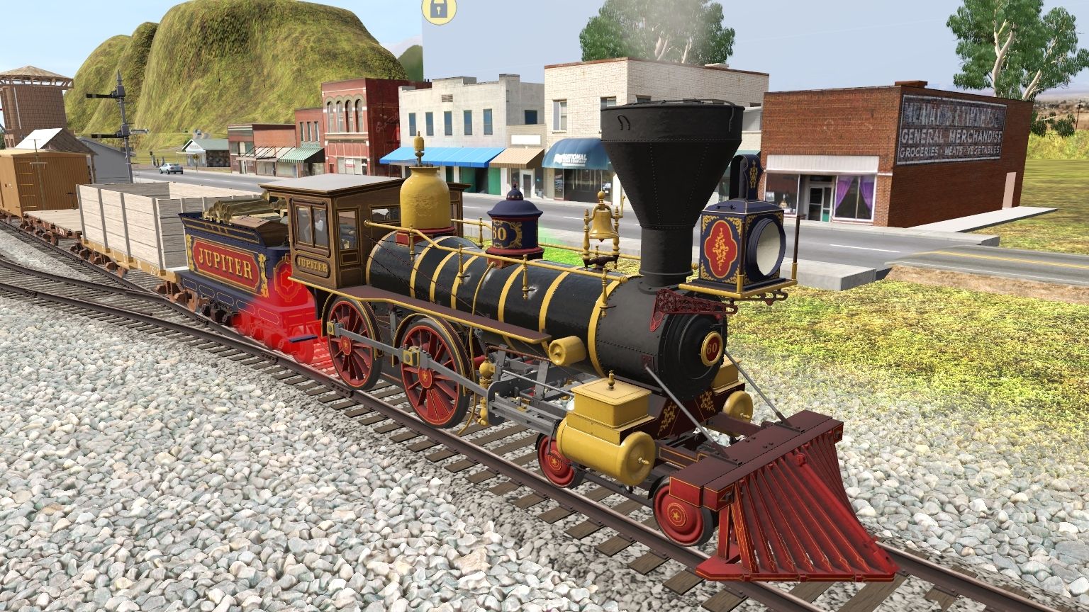 Tags: Trainz Railroad Simulator 2019, Model Layout, Model Layout - Default, Central Pacific 60 'Jupiter, Central Pacific 60 Tender, Central Pacific 30' tall gondola (red), Central Pacific 30ft 1860s Platform Car 2, Central Pacific 34' boxcar, Central Pacific 30ft 1860s Platform Car 1, Central Pacific 30' short gondola (red), Central Pacific 24' flatcar (Yellow), Central Pacific 24' flatcar (Red), Central Pacific 28' combination boxcar, Central Pacific Water Car; Rectangular