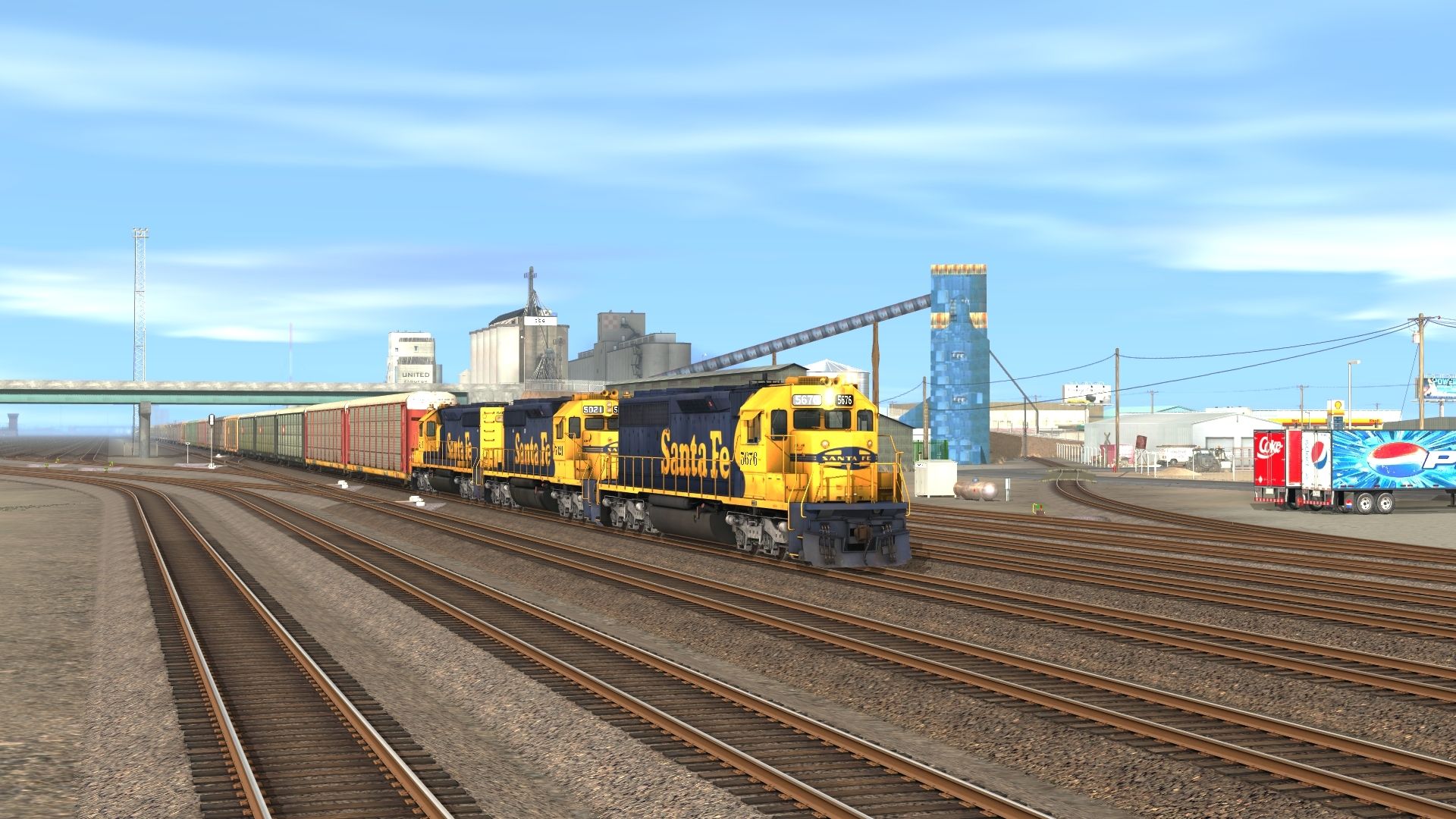 Tags: Trainz: A New Era, BNSF: Clovis to Lubbock, ATSF racks 1, ATSF SD45-2 blue/yellow warbonnet, ATSF SD40-2 2a 123 inch short hood, ATSF SD40-2 2a, 89ft Autorack Tri-Level CP # 541466, 89ft Autorack Tri-Level CN # 964644, 89ft Autorack Tri-Level SP # 54523, 89ft Autorack Tri-Level UP # 459682, 89ft Autorack Tri-Level UP # 454655, 89ft Autorack Tri-Level CSX # 864582, 89ft Autorack Tri-Level SOO # 594559, 89ft Autorack Tri-Level GTW # 346225