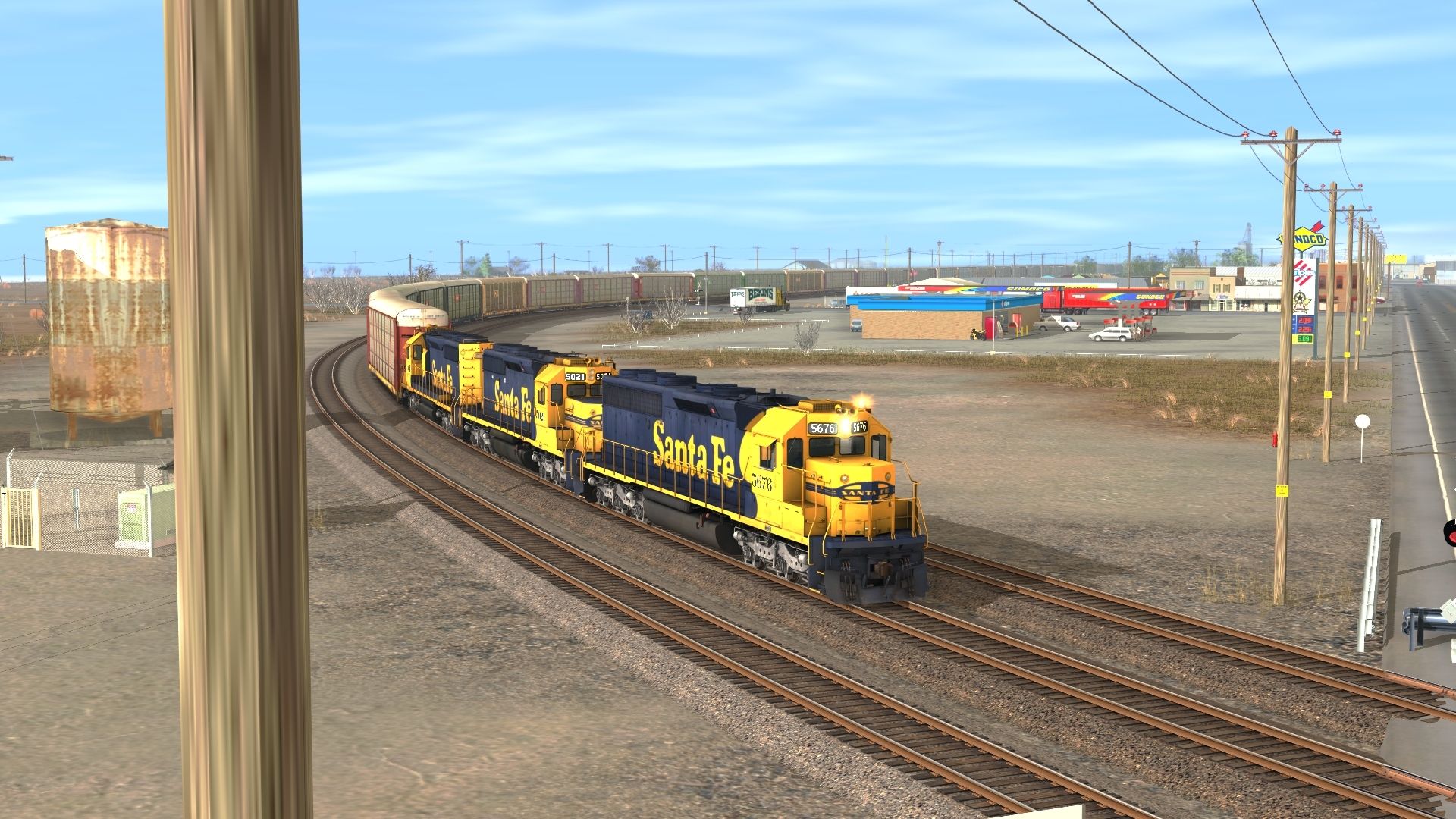 Tags: Trainz: A New Era, BNSF: Clovis to Lubbock, ATSF racks 1, ATSF SD45-2 blue/yellow warbonnet, ATSF SD40-2 2a 123 inch short hood, ATSF SD40-2 2a, 89ft Autorack Tri-Level CP # 541466, 89ft Autorack Tri-Level CN # 964644, 89ft Autorack Tri-Level SP # 54523, 89ft Autorack Tri-Level UP # 459682, 89ft Autorack Tri-Level UP # 454655, 89ft Autorack Tri-Level CSX # 864582, 89ft Autorack Tri-Level SOO # 594559, 89ft Autorack Tri-Level GTW # 346225