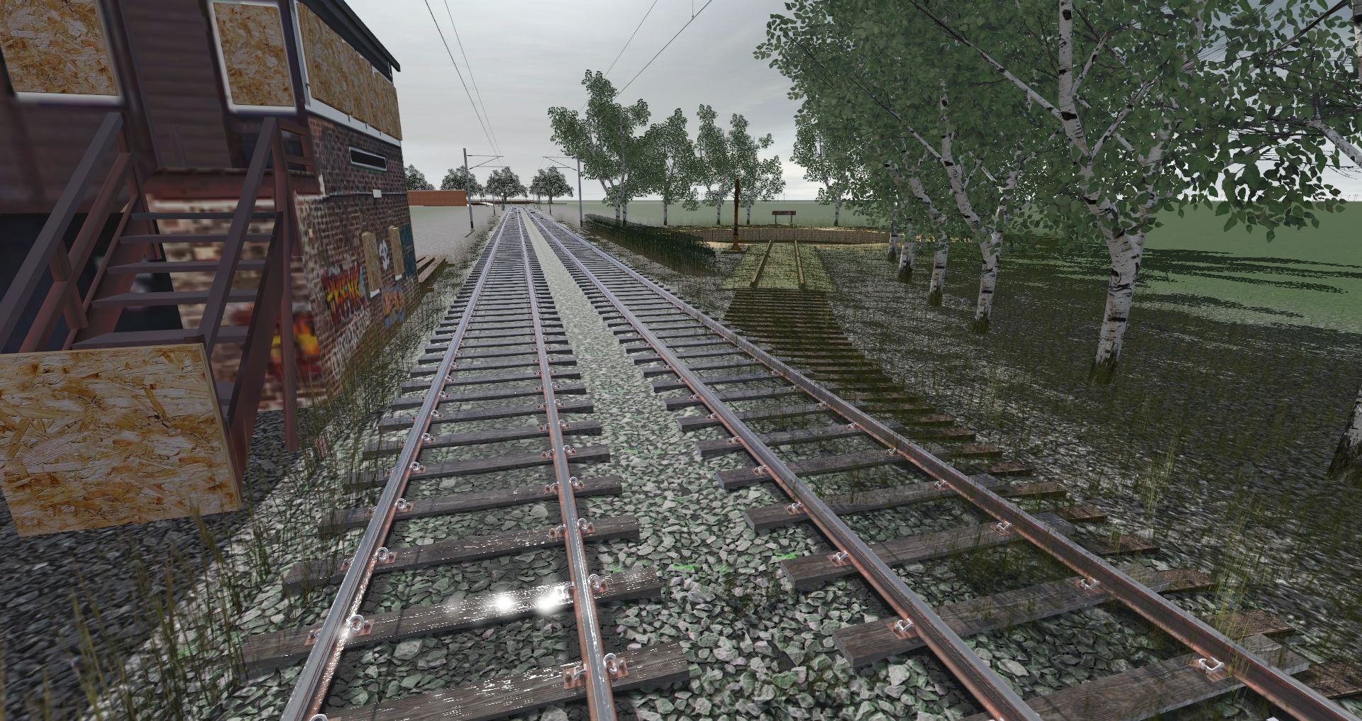 Caption: The South end of the old station and the entrance to the sidings. All that remains are sleepers and rusted rail
