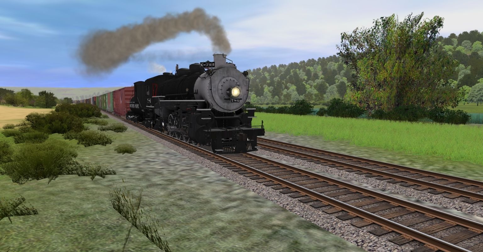 Tags: Trainz: A New Era, Happy Place RR, SP MK-5 Engine, SP MK-5 Tender V2, 50ft Boxcar BN #223471, 50ft Boxcar BN #223936, 50ft Boxcar BN #244378, 50ft Boxcar BN #244626, 50ft Boxcar BN #249089, 52ft Gondola GONX 2, 73ft Centerbeam NOKL, 73ft Centerbeam TTX 2, 73ft Centerbeam TTX 3