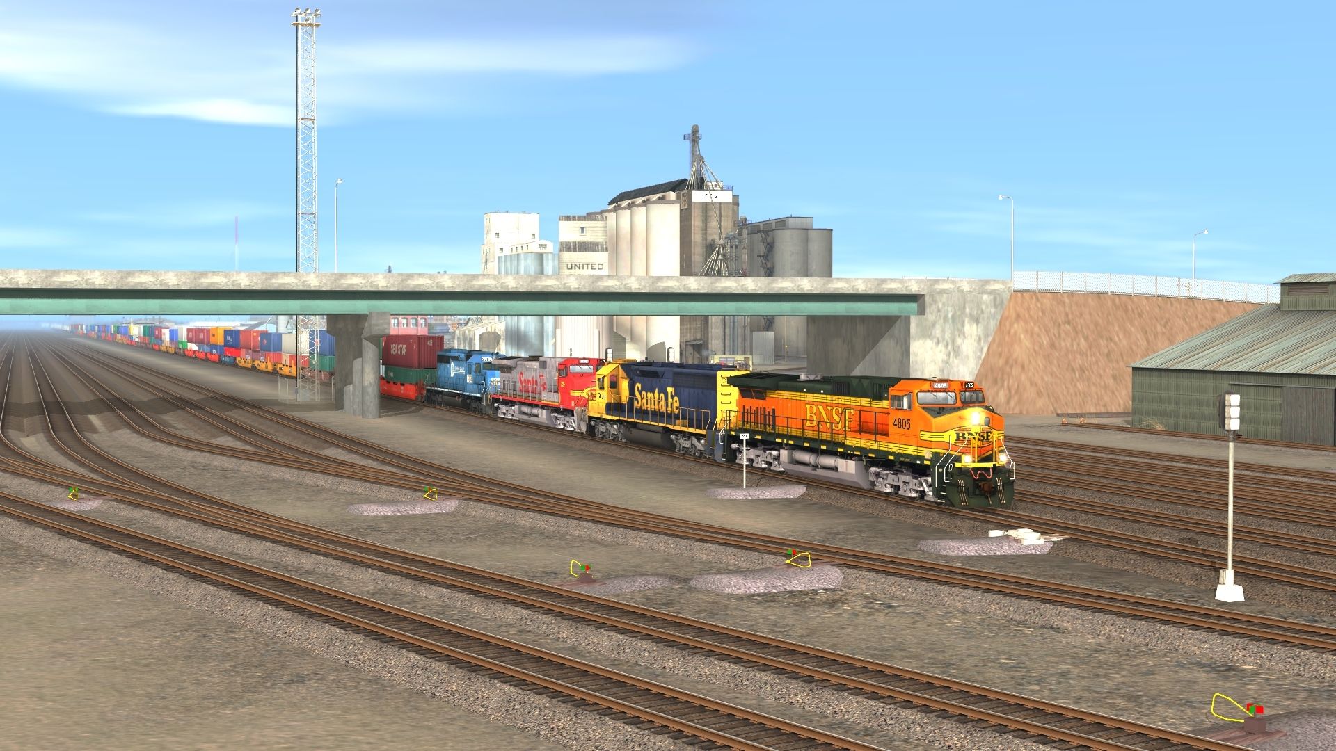 Tags: Trainz: A New Era, BNSF: Clovis to Lubbock, Early BNSF stax 1, BNSF C44-9W h2 new, ATSF SD45-2 blue/yellow warbonnet, ATSF C44-9W, NS SD40-2 3352, BN 48 Husky Stack Early, BNSF 48 Husky Stack Early, TTX 48 Husky Stack, Trailer Train 48 Husky Stack, CSX Intermodal 48 Husky Stack, SP 48 Husky Stack, Spinecar A Unit