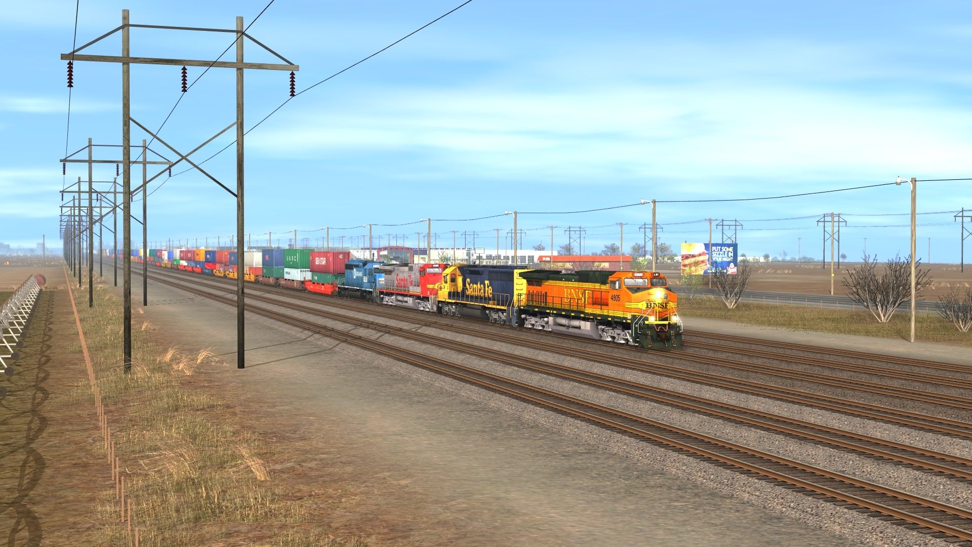 Tags: Trainz: A New Era, BNSF: Clovis to Lubbock, Early BNSF stax 1, BNSF C44-9W h2 new, ATSF SD45-2 blue/yellow warbonnet, ATSF C44-9W, NS SD40-2 3352, BN 48 Husky Stack Early, BNSF 48 Husky Stack Early, TTX 48 Husky Stack, Trailer Train 48 Husky Stack, CSX Intermodal 48 Husky Stack, SP 48 Husky Stack, Spinecar A Unit