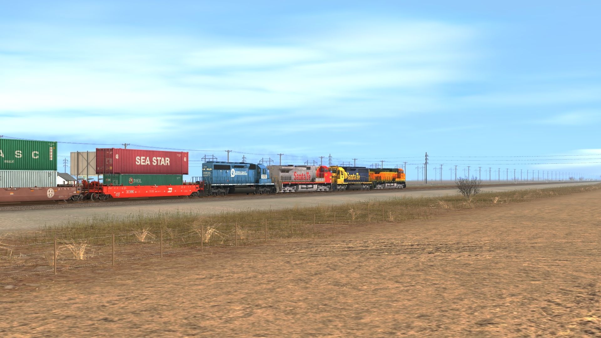 Tags: Trainz: A New Era, BNSF: Clovis to Lubbock, Early BNSF stax 1, NS SD40-2 3352, ATSF C44-9W, ATSF SD45-2 blue/yellow warbonnet, BNSF C44-9W h2 new, BN SD60M, ATSF GP60M, TTX 48 Husky Stack, Trailer Train 48 Husky Stack, BNSF 48 Husky Stack Early, CSX Intermodal 48 Husky Stack, BN 48 Husky Stack Early