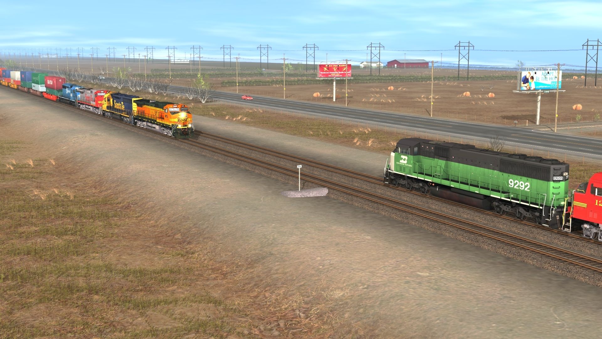 Tags: Trainz: A New Era, BNSF: Clovis to Lubbock, Early BNSF stax 1, ATSF GP60M, BN SD60M, BNSF C44-9W h2 new, ATSF SD45-2 blue/yellow warbonnet, ATSF C44-9W, NS SD40-2 3352, 89ft Autorack Tri-Level ATSF # 975778, 89ft Autorack Tri-Level BNSF # 820668, 89ft Autorack Tri-Level CN # 535168, 89ft Autorack Tri-Level BN # 908668, 89ft Autorack Tri-Level CN # 964644