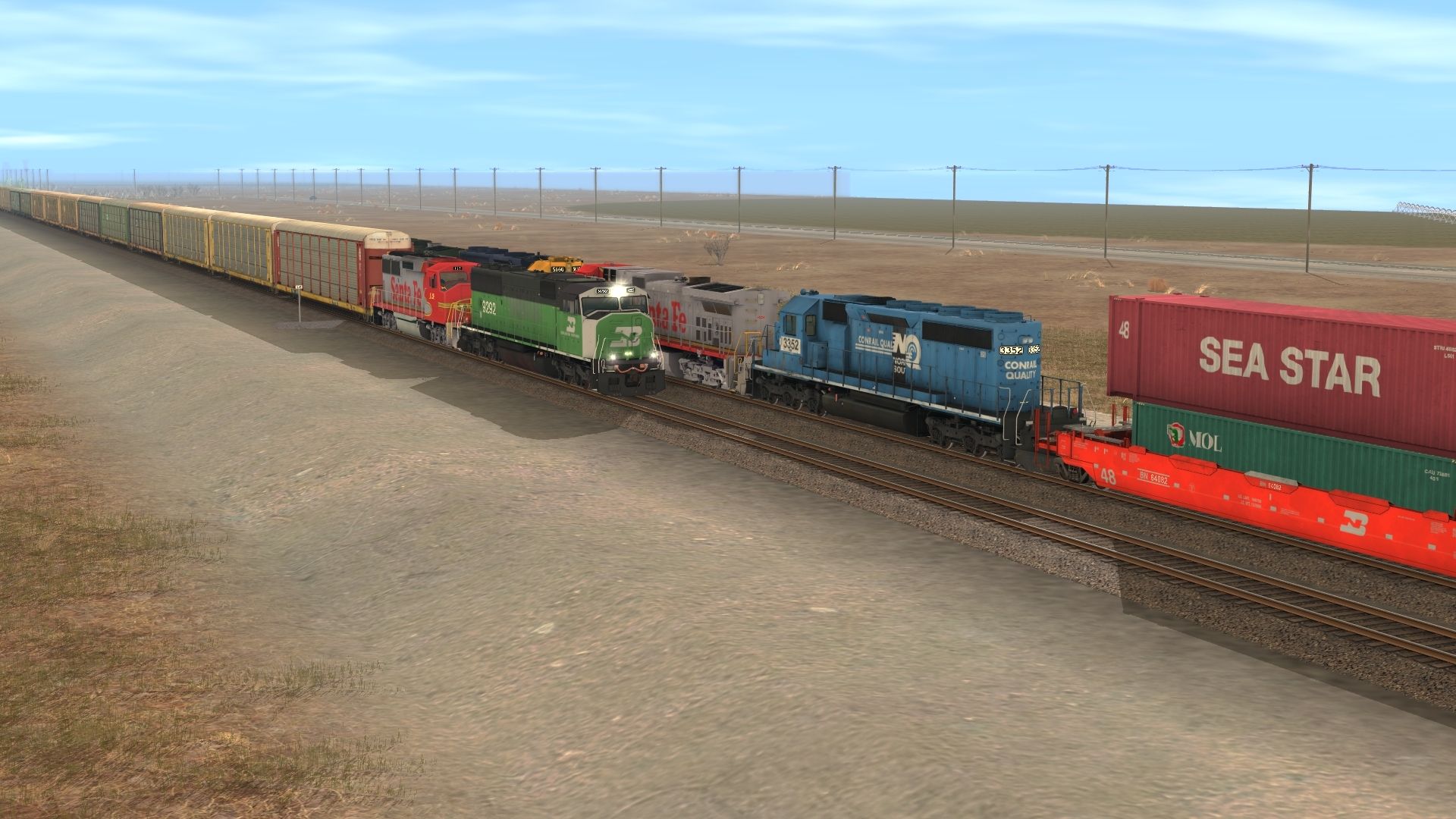 Tags: Trainz: A New Era, BNSF: Clovis to Lubbock, Early BNSF stax 1, NS SD40-2 3352, ATSF C44-9W, BN SD60M, ATSF GP60M, ATSF SD45-2 blue/yellow warbonnet, BNSF C44-9W h2 new, BNSF 48 Husky Stack Early, TTX 48 Husky Stack, BN 48 Husky Stack Early, Trailer Train 48 Husky Stack, CSX Intermodal 48 Husky Stack
