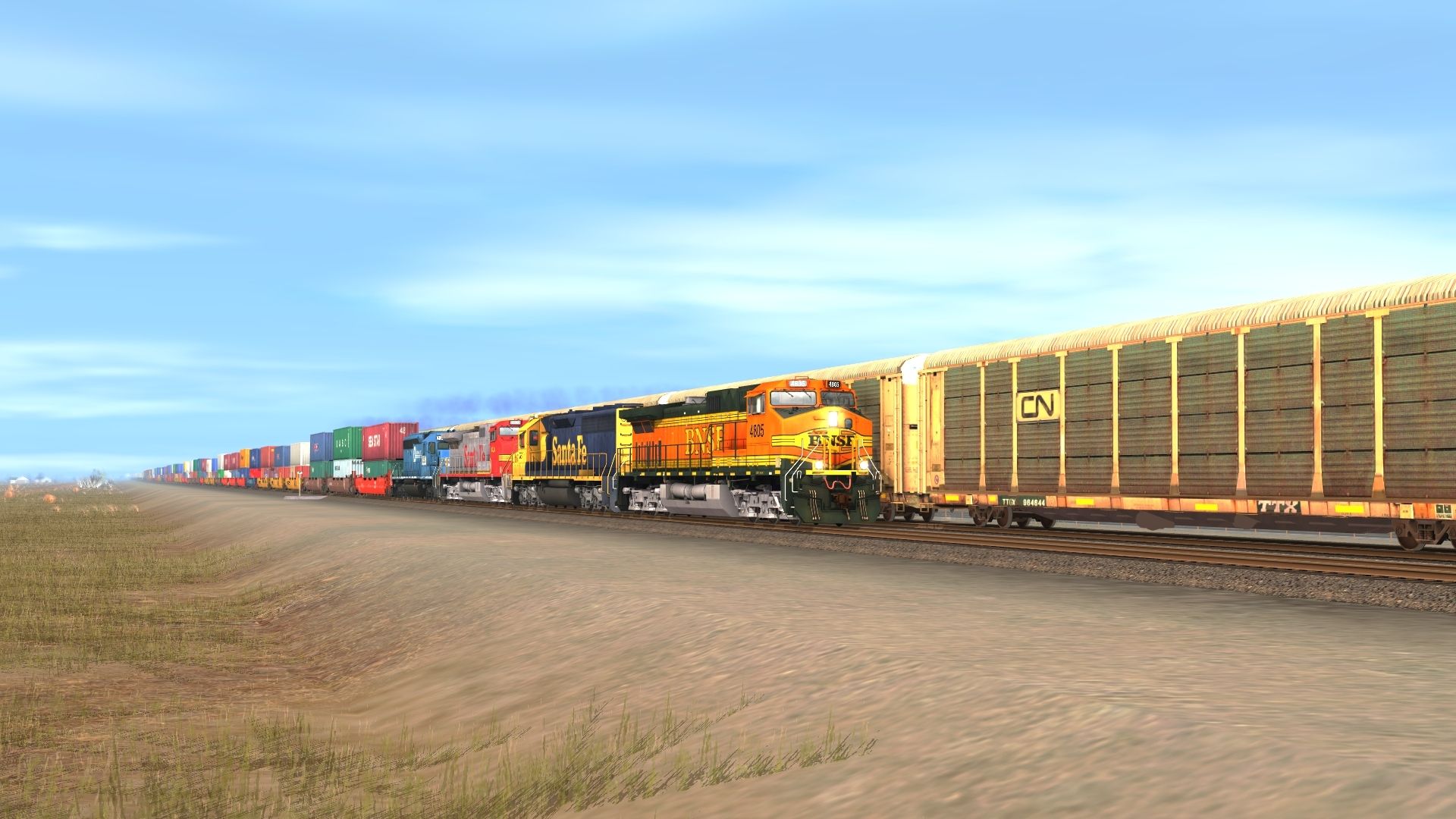 Tags: Trainz: A New Era, BNSF: Clovis to Lubbock, Early BNSF stax 1, BNSF C44-9W h2 new, ATSF SD45-2 blue/yellow warbonnet, ATSF C44-9W, NS SD40-2 3352, ATSF GP60M, BN SD60M, 89ft Autorack Tri-Level CP # 541466, 89ft Autorack Tri-Level CP # 541432, 89ft Autorack Tri-Level UP # 454655, 89ft Autorack Tri-Level UP # 459682, 89ft Autorack Tri-Level CN # 964644