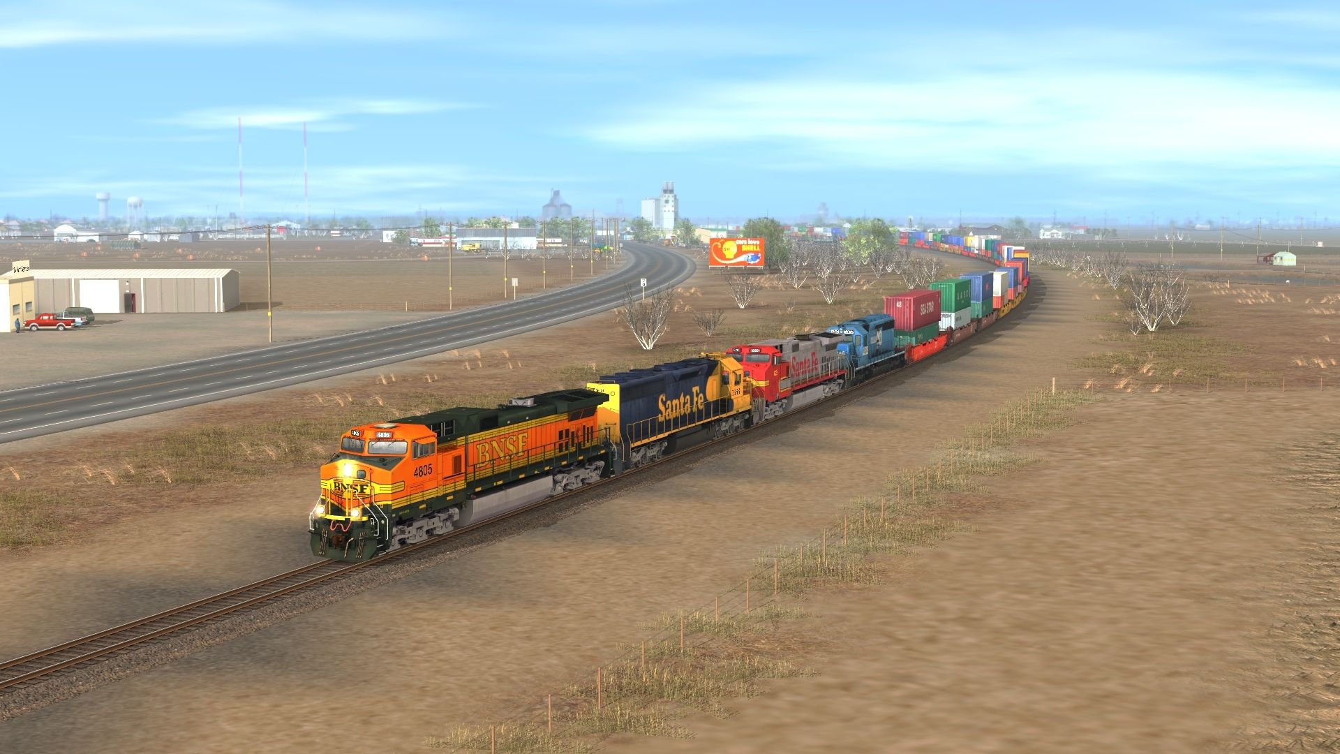 Tags: Trainz: A New Era, BNSF: Clovis to Lubbock, Early BNSF stax 1, BNSF C44-9W h2 new, ATSF SD45-2 blue/yellow warbonnet, ATSF C44-9W, NS SD40-2 3352, BN 48 Husky Stack Early, BNSF 48 Husky Stack Early, TTX 48 Husky Stack, Trailer Train 48 Husky Stack, CSX Intermodal 48 Husky Stack, SP 48 Husky Stack, Spinecar A Unit