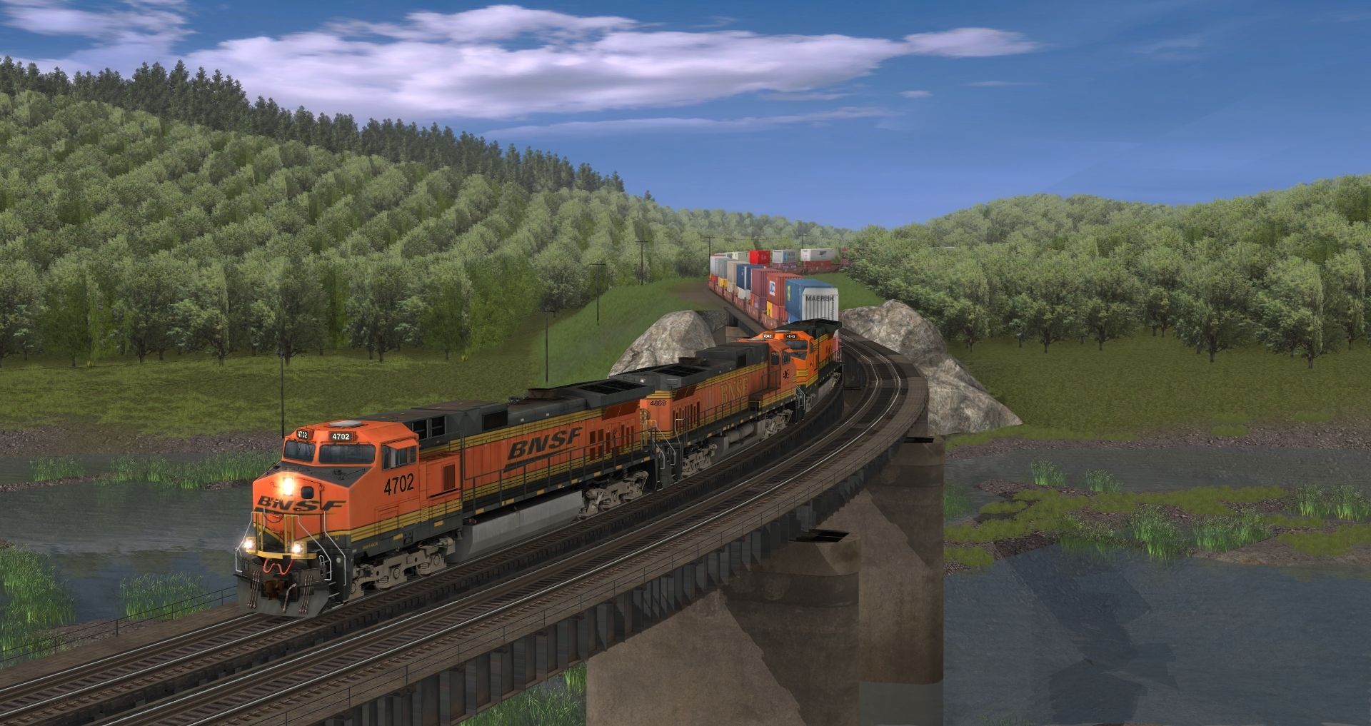 Tags: Trainz: A New Era, Iron Horse Valley, Default, BNSF Dash 9-44CW h2, BNSF Dash 9-44CW h3, 53ft BNSF H2 Wellcar Weathered (Single), 53ft BNSF H2 Wellcar (Single)