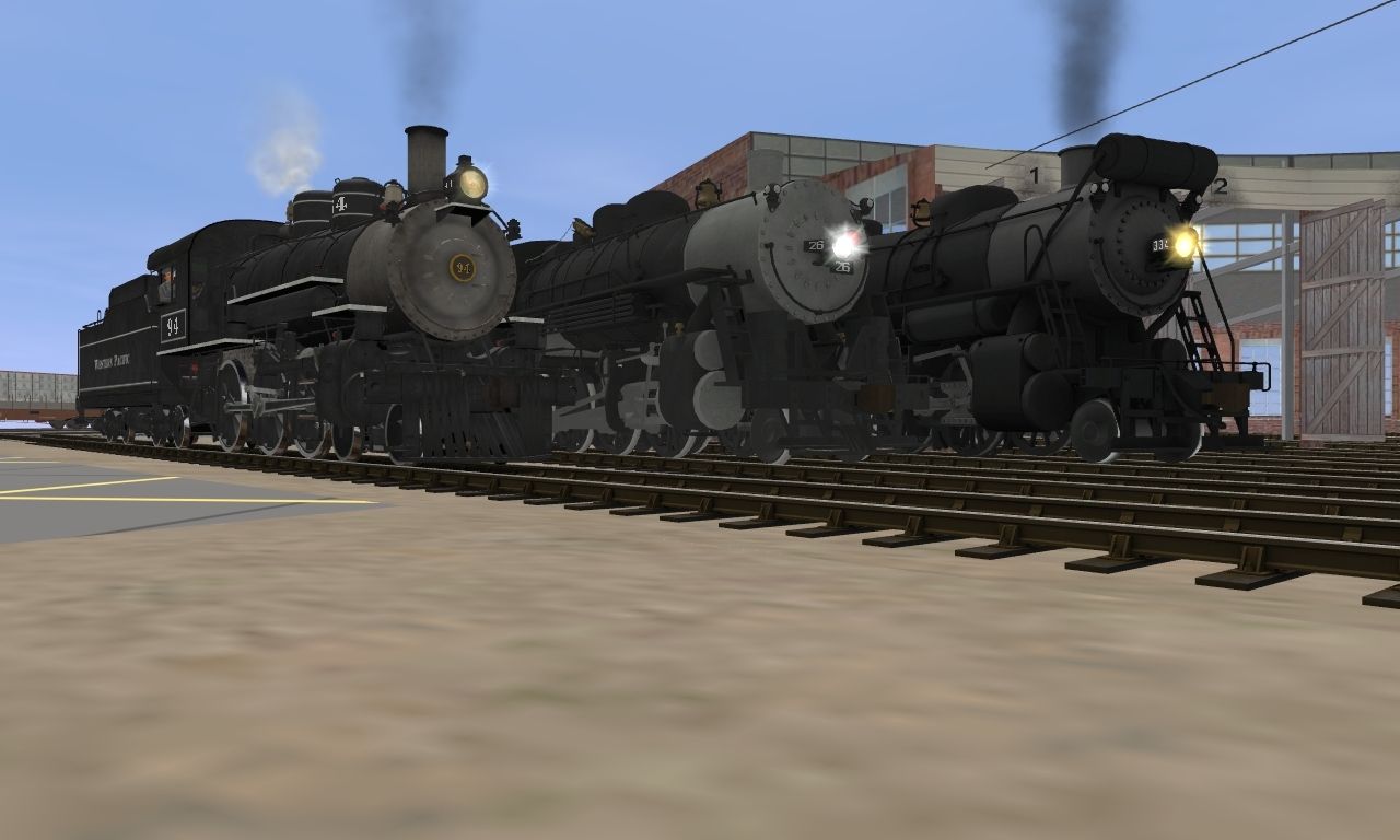 Caption: Surviving Western Pacific steam locomotives: 4-6-0 #94, C-43 2-8-0 #26, and MK60 2-8-2 #334