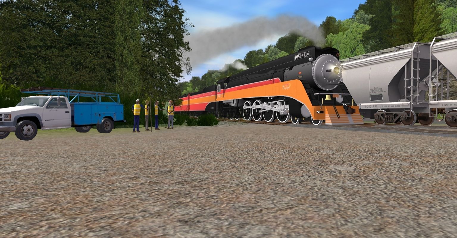 Tags: Trainz: A New Era, Happy Place RR, SP GS-2 #4410 1937 Daylight Engine, FL&HPRR C-1 Tender, TBS Light Decapod - Black:BW, SP GS-2 #4410 1937 Daylight Tender, SP 1937 Coast Daylight Baggage-Chair Car, SP 1937 Coast Daylight Articulated Chair Car Mens, SP 1937 Coast Daylight Articulated Chair Car Womens, SP 1937 Coast Daylight Triple Articulated Coffee Shop, JRPX ACF Centerflow 4 Bay round hatch, SP 1937 Coast Daylight Triple Articulated Kitchen Car, SP 1937 Coast Daylight Triple Articulated Diner Car