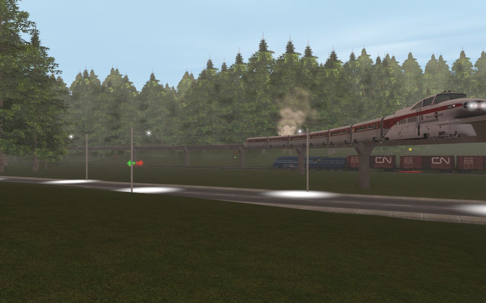 Tags: Trainz Railroad Simulator 2019, New Route, Default, Aerotrain ATSF Loco, LMS Princess Coronation Blue, Aerotrain GM Coach, Aerotrain GM Coach Obs, Custom 40' Boxcar - #7, LMS Princess Coronation Blue Tender, Custom 40' Boxcar - #2, 50ft Boxcar UP #369009, BN 60Ft.9In. woodchip gondola 70's dirty