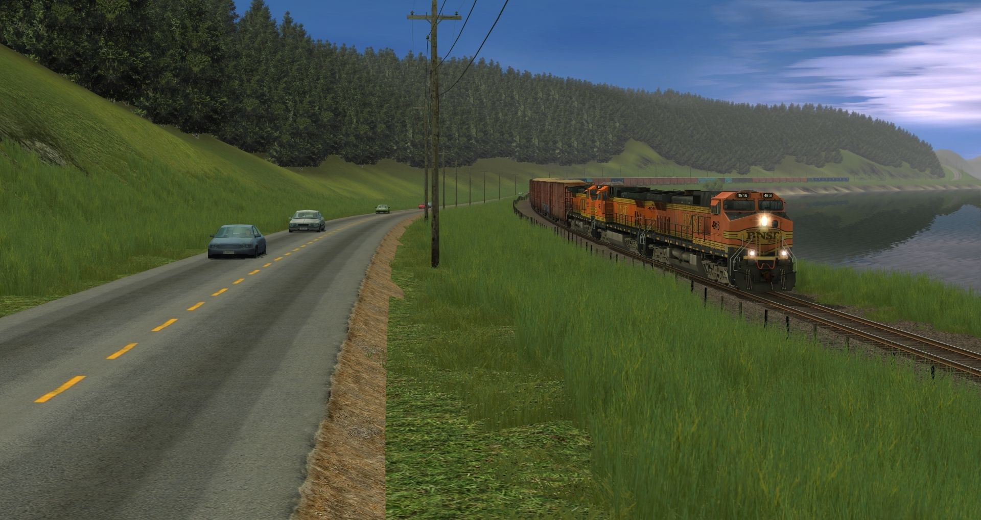 Tags: Trainz: A New Era, Iron Horse Valley, Default, BNSF Dash 9-44CW h2, APA 60Ft.9In. woodchip gondola, BFTX 60Ft.9In. woodchip gondola, BNSF 60Ft.9In. woodchip gondola 00's dirty, MRL 60Ft.9In. woodchip gondola
