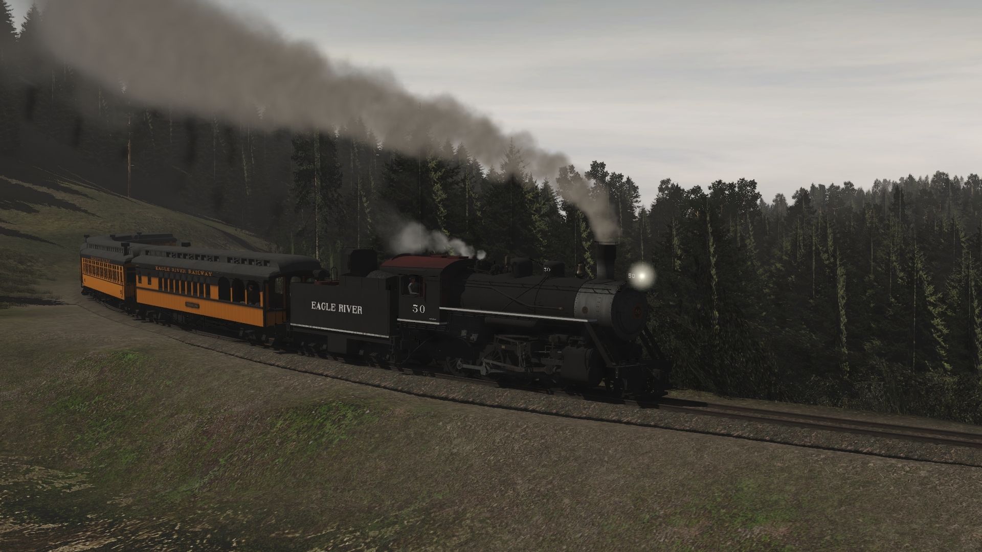 Tags: Trainz Railroad Simulator 2019, Eagle River Railway, Default, Eagle River 2-8-0 Engine 2, Eagle River 2-8-0 Tender 2, Eagle River 07 Wood Observation, Eagle River 02 Wood Coach, Eagle River 01 Wood Combine