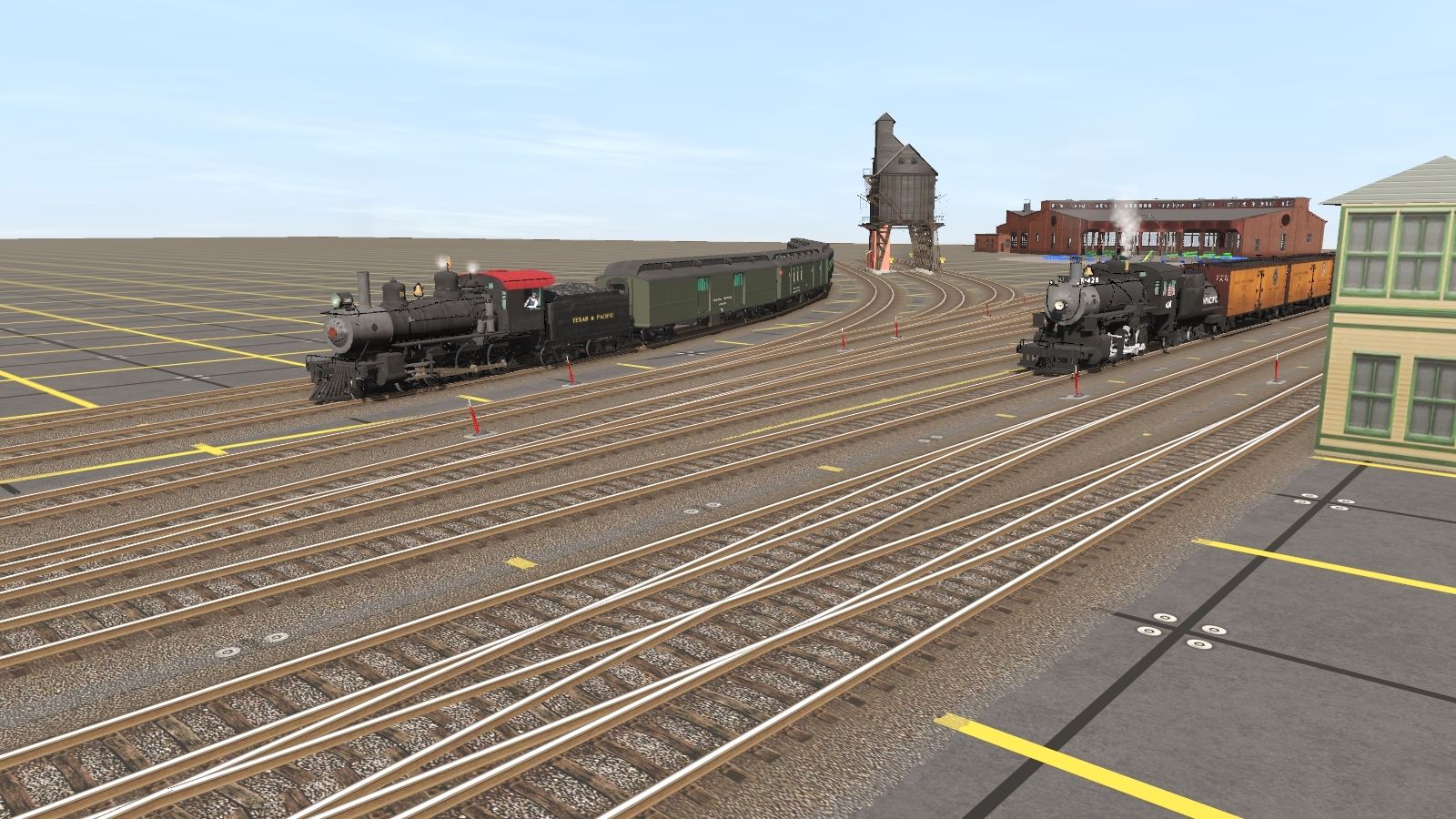 Tags: Trainz Railroad Simulator 2019, Model Layout, Default, Texas and Pacific 4-6-0 #316, Union Pacific C-57 #428 Engine, Texas and Pacific 4-6-0 #316 Tender, Union Pacific C-57 #428 Tender, Unlettered Pullman Baggage-Express Car, PFE R-40-2 Reefer Late, Unlettered Pullman Style RPO-Baggage Combine, PFE R-40-2 Reefer Early, Unlettered Pullman Coach, Caboose (Wide Vision) - SLSF