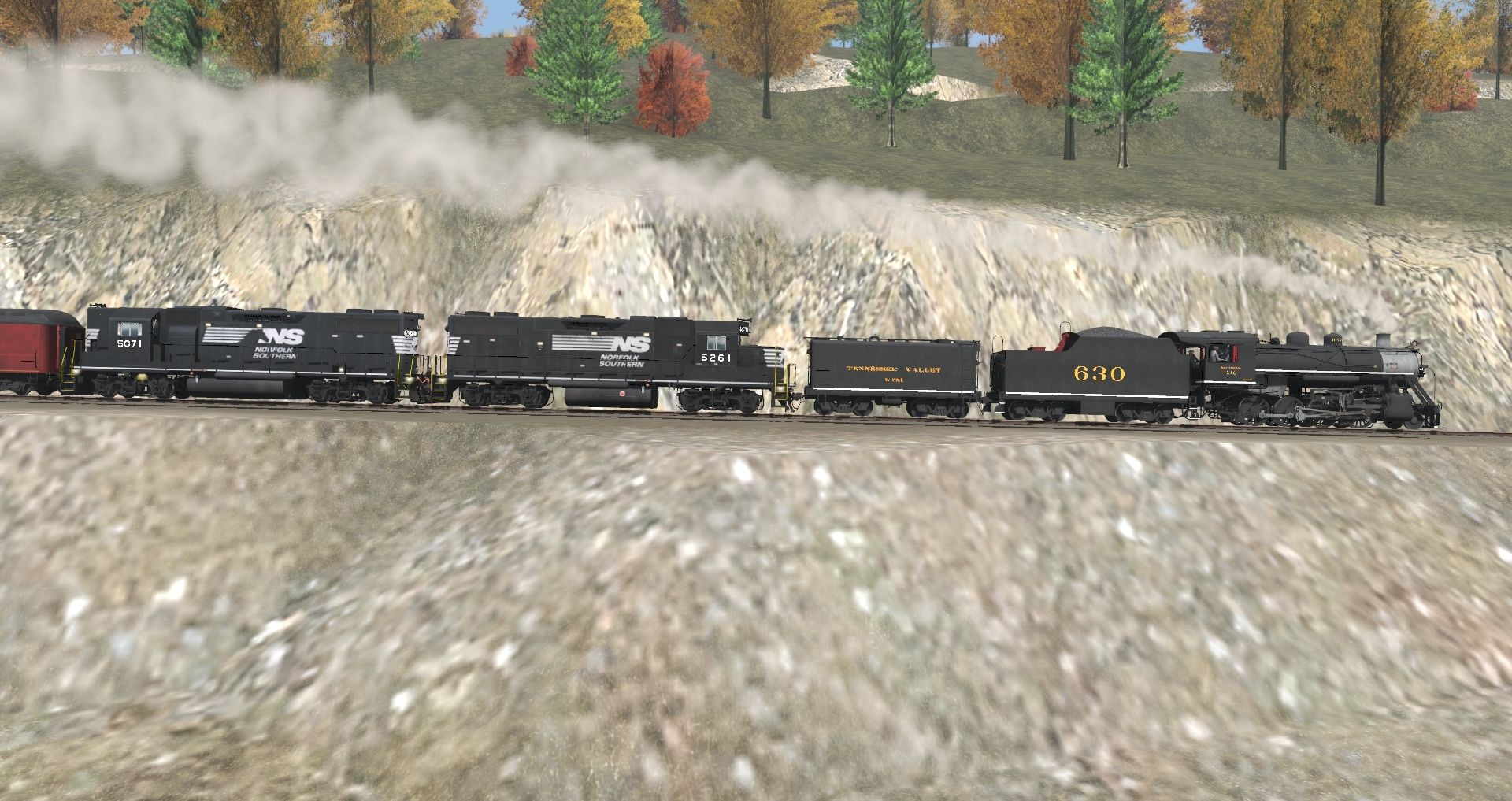 Tags: Trainz Railroad Simulator 2019, The Loops, NS GP38-2 LH, Southern 630 Engine, NS GP38-2, Southern 630 Aux Tender V1, Southern 630 Tender, N&W Tool Car #1407, TVRM Coach Lounge, Silver Coach, TVRM Tool Car 50, N&W NS Powhatan Arrow 03 P3 Standard Coach 535, Southern Coach Lounge