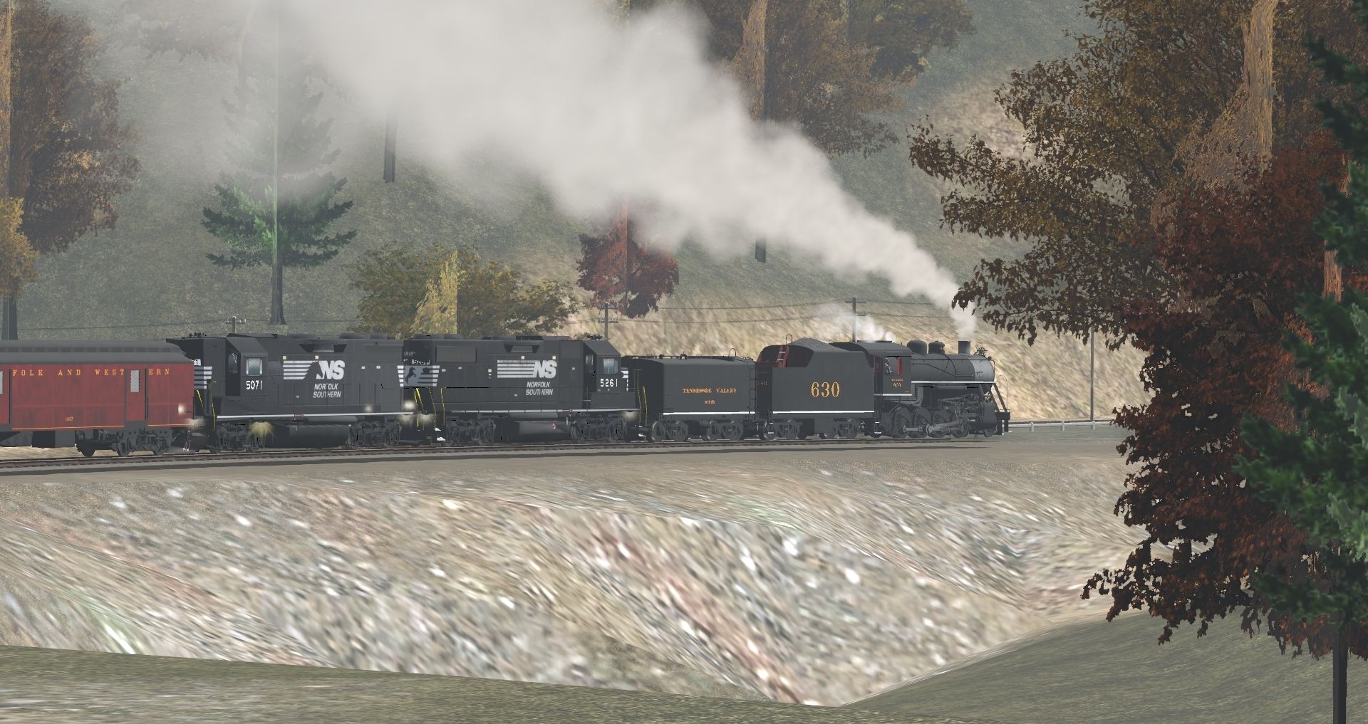 Tags: Trainz Railroad Simulator 2019, The Loops, NS GP38-2, NS GP38-2 LH, Southern 630 Engine, TVRM Observation Eden Isle, Southern Coach Lounge, N&W NS Powhatan Arrow 03 P3 Standard Coach 535, TVRM Tool Car 50, Silver Coach, TVRM Coach Lounge, N&W Tool Car #1407, Southern 630 Aux Tender V1