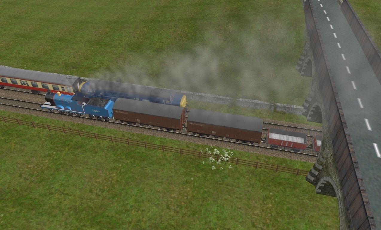 Tags: Trainz: A New Era, Tidmouth V4, BR Mainline Blue Class 37167, Jeff The Blue Engine, BR 13T Shock Open Diag 1/040, BR VDA brown with Railfreight logos, BR 8T Cattle Wagon, Jeff The Blue Engine's Tender, BR Freight CAR Brake Bauxite, BR MK1 Crimson & Cream SO, BR MK1 Crimson & Cream SK, BR MK1 FK, BR MK1 Crimson & Cream BSK