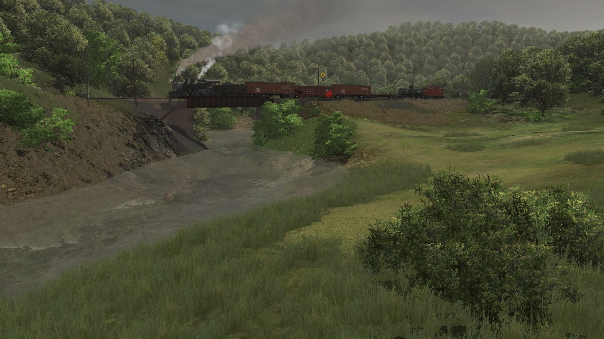 Tags: Trainz: A New Era, Coal Country, PRR D16sb Engine, PRR D16sb Tender, M&PA Wood Boxcar, PRR H21a Hopper, M&PA Flat Car, Tidewater Tank Car, SRC Caboose 12