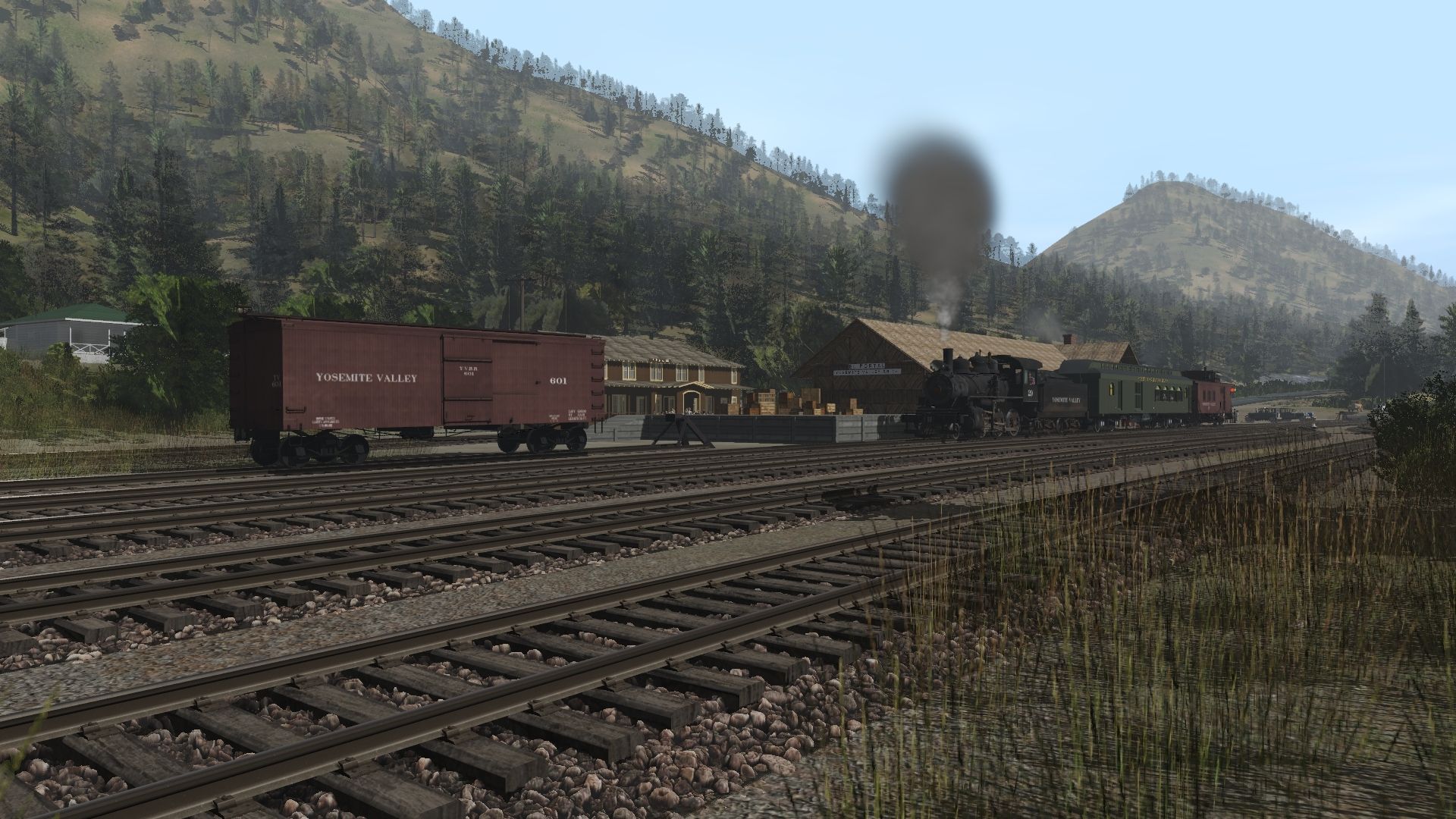 Tags: Trainz Railroad Simulator 2019, Yosemite Valley Railroad ver. 2018, Default, Yosemite Valley 2-6-0 29, YVRR Boxcar 601, Yosemite Valley 2-6-0 29 tender, YVRR_Combine_105, YVRR Caboose 17 - Second