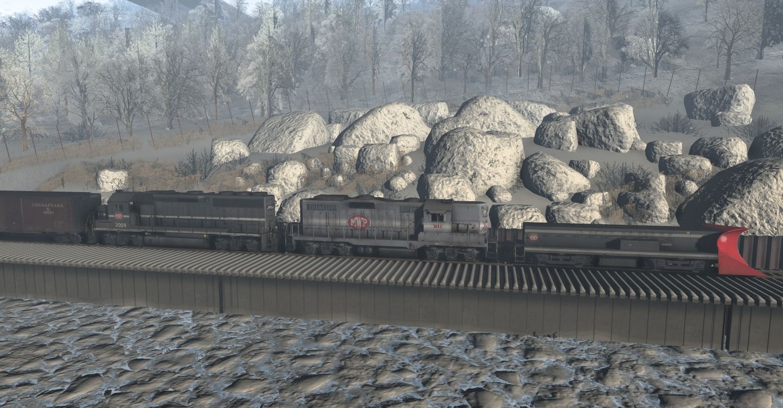 Tags: Trainz: A New Era, Monongahela & Western Pennsylvania, Snowfall Assist, MWPX GP18, MWPX GP40-2, MWP Snow Plow, 40ft Boxcar C&O, PPLX 100 Ton Hopper, MWPX 140 ton flat car
