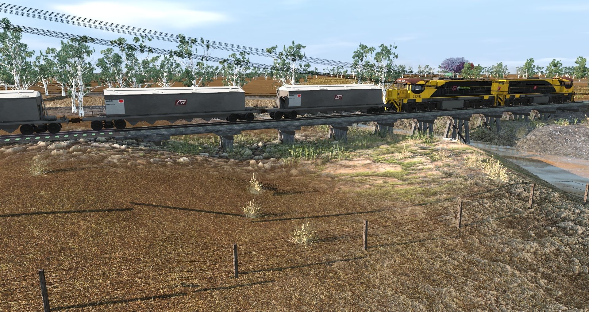 Tags: Trainz Railroad Simulator 2019, AA Main Line, Default, QR National 2300D, QR 2490H 2015+, QR C16 38 medium gauge, QR VAOG Grain wagon, QDR 3F6I NG C-17 935 tender, QR WHE wheat wagon, QR WHE wheat wagon covered, QR V12583, QR VJM23645NG, QR NG Sheep Wagon Buffer version, QR NG KA Cattle Weathered
