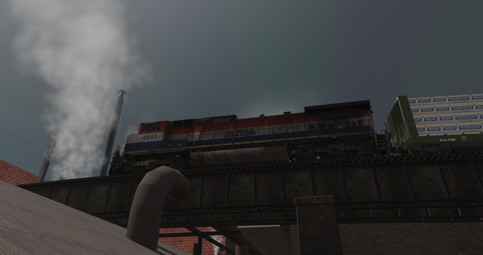 Tags: Trainz Railroad Simulator 2019, Port Zyd & Fulazturn Railroad - Model Trainz, BC Rail C44-9WL 4641-4644, BC Rail 52'8'' Bulkhead Flatcar With Center Stakes Tolko