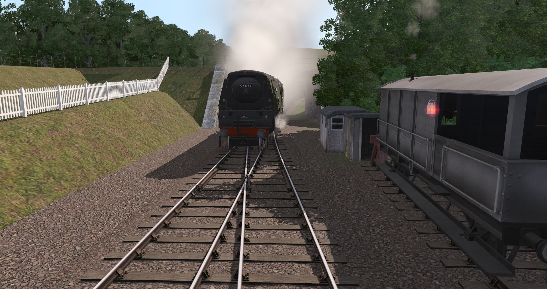 Tags: Trainz Railroad Simulator 2019, Swanage Railway, Editing Session, SR Light Pacific Battle of Britain class loco, Class 33 Brunswick Green, GWR Fruit D van w ACS, BR(W) 20T Toad Brake Van Weathered Unfitted, BR Standard 12T Van Weathered with Markings, cowans_match black, cowans_relievin black, cowans_crane black, Esso 18 foot Tanker Early detailed - weathered, BR Mk1 BSK Green, BR Mk1 TSO Green