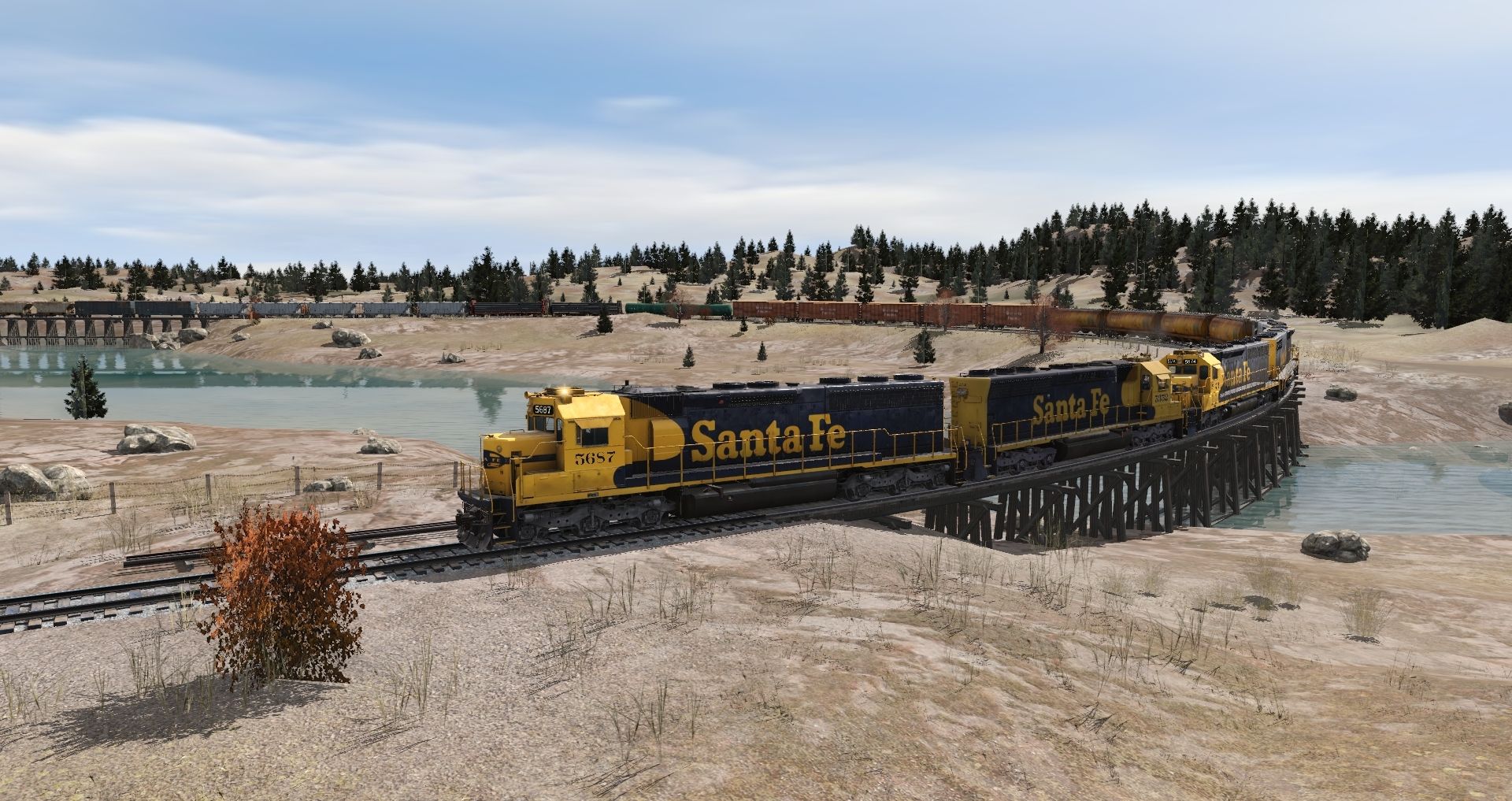 Tags: Trainz Railroad Simulator 2019, Legacy of the Burlington Northern v2, Heavy Iron 2, ATSF SD45-2 blue/yellow warbonnet, ATSF SD45, ATSF SD45-2B, SIRX Cylindrical Hopper, SP 60Ft.9In. woodchip gondola, TILX 23000 gal Funnel-Flow tank car, UP PS-2 3510, SP P-S 50_6ft Boxcar, UP 2 bay Trinity hopper weathered, UP 2 bay Trinity hopper clean 2, RUSX ACF Centerflow 3 Bay long hatch