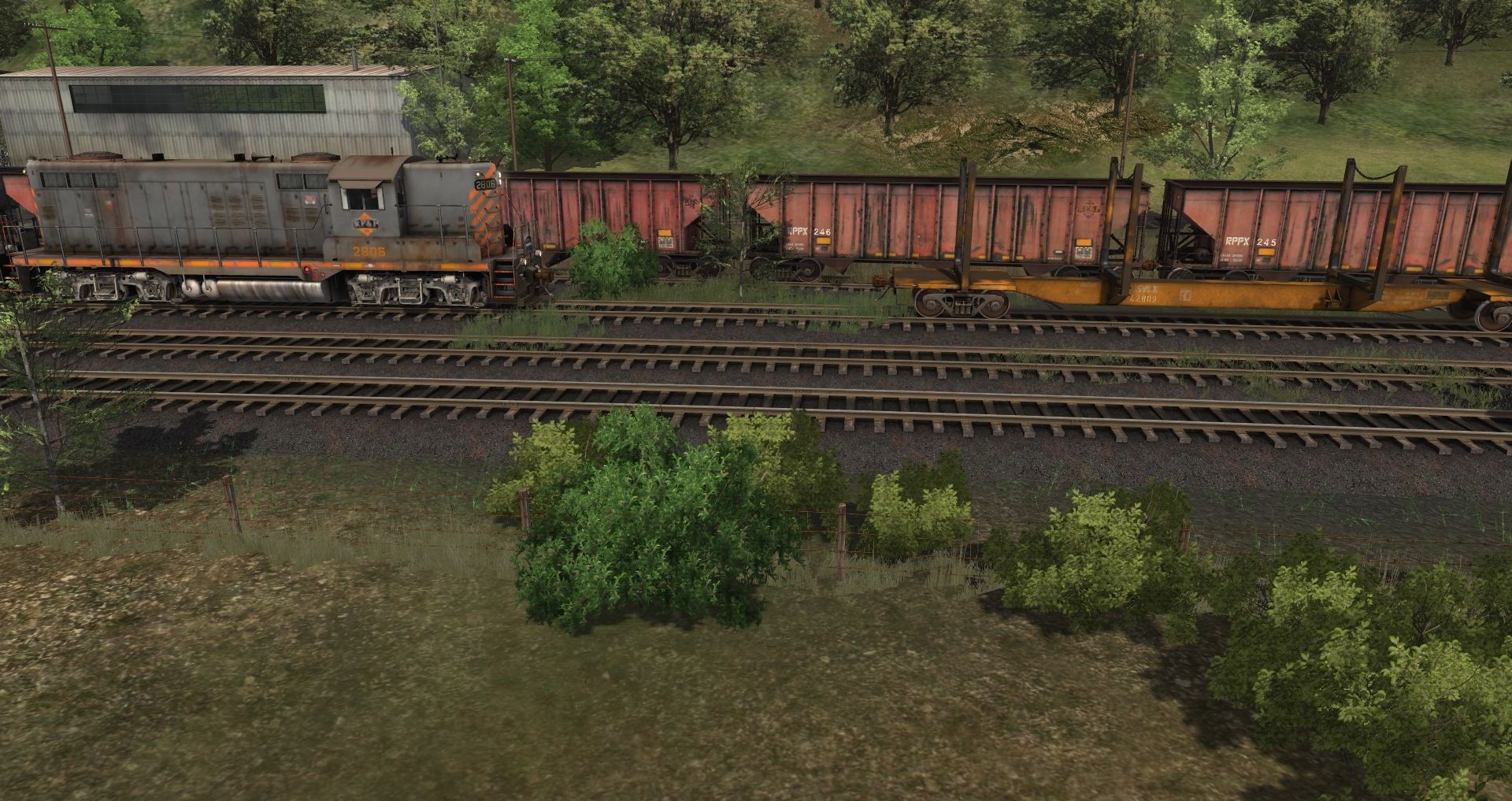 Tags: Trainz: A New Era, Coal Country, JR-Coal Country: Session 2 Parker Switching, RPPX GP9 high, RPPX GP9 chop nose, SVLX Log Rack Yellow, RPPX Transfer Caboose, RPPX Shoving Platform, RPPX 100 Ton Hopper