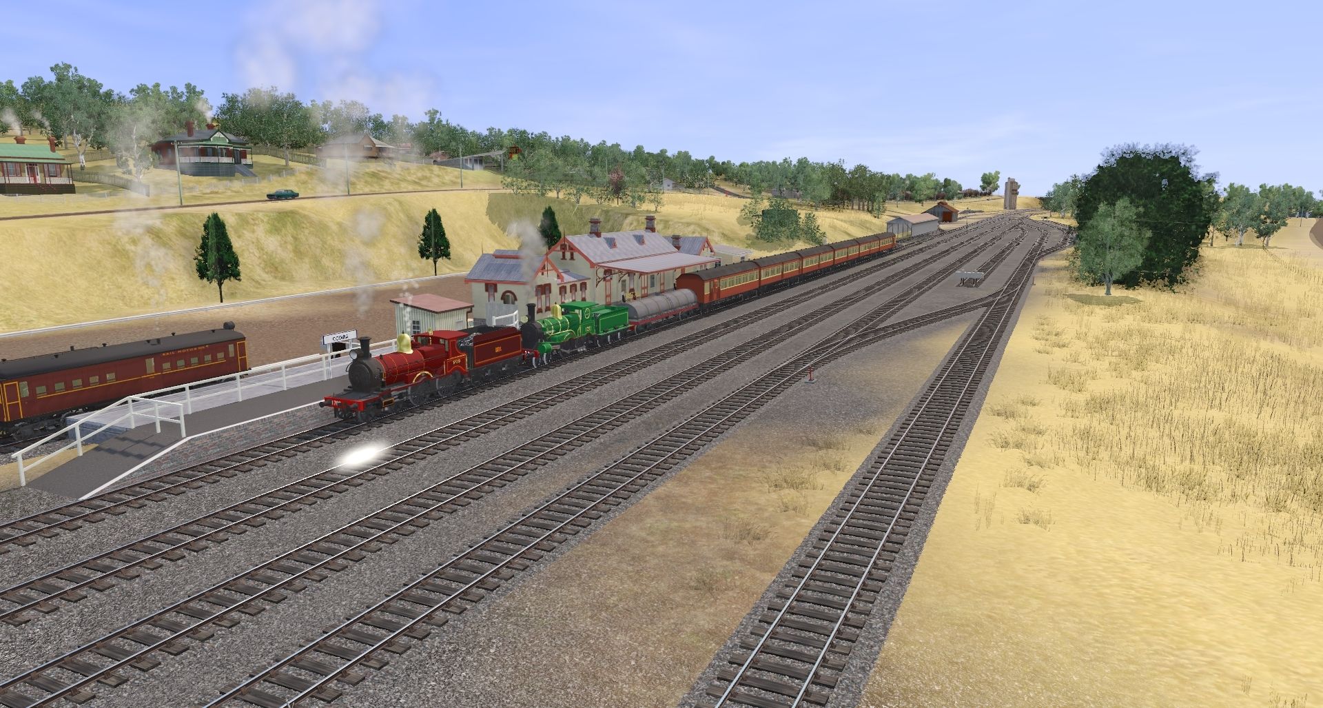 Tags: Trainz Railroad Simulator 2019, WeddinNSW V4 (TRS2019), WeddinNSW V4 (TRS2019) - Default, NSWGR Z17 Loco, NSWGR CPH Railmotor, NSWGR Z12 green Loco, NSWGR Z17 tender, NSWGR Z12 green tender, NSWGR Water Gin Red Frame - Trender Scipt, NSWGR R Set HR 2nd Class Car - Tuscan and Russet livery (The Caves Express Southern Highlands Express The Fish) (TS12 SP1 HF4), NSWGR R Set RBR 2nd Class Buffet Car - Tuscan and Russet livery (The Caves Express Southern Highlands Express The Fish) (TS12 SP1 HF4), NSWGR R Set BR 2nd Class Car - Tuscan and Russet livery (The Caves Express Southern Highlands Express The Fish) (TS12 SP1 HF4), NSWGR R Set FR 1st Class Car - Tuscan and Russet livery (The Caves Express Southern Highlands Express The Fish) (TS12 SP1 HF4)