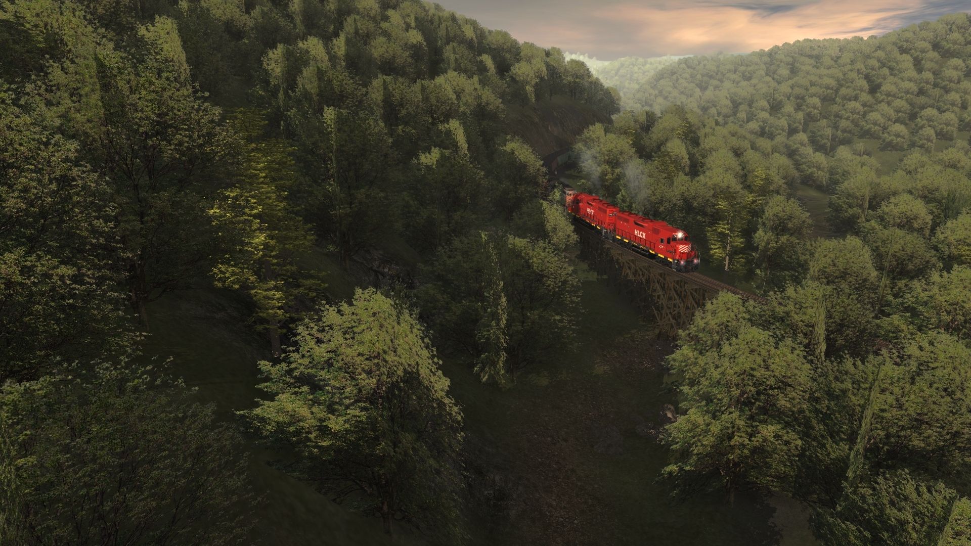 Tags: Trainz: A New Era, Coal Country, 03 - Coal Service #, GP38-2 HLCX DES, RPPX GP9 chop nose, RPPX GP18 (ex-CR), RPPX 100 Ton Hopper, 52ft Gondola CEFX 2, 52ft Gondola CEFX 1, RPPX Coach Car Dome, RPPX Coach Car #21, RPPX Coach Car #20, RPPX Coach Car #22, SVLX Log Rack Yellow
