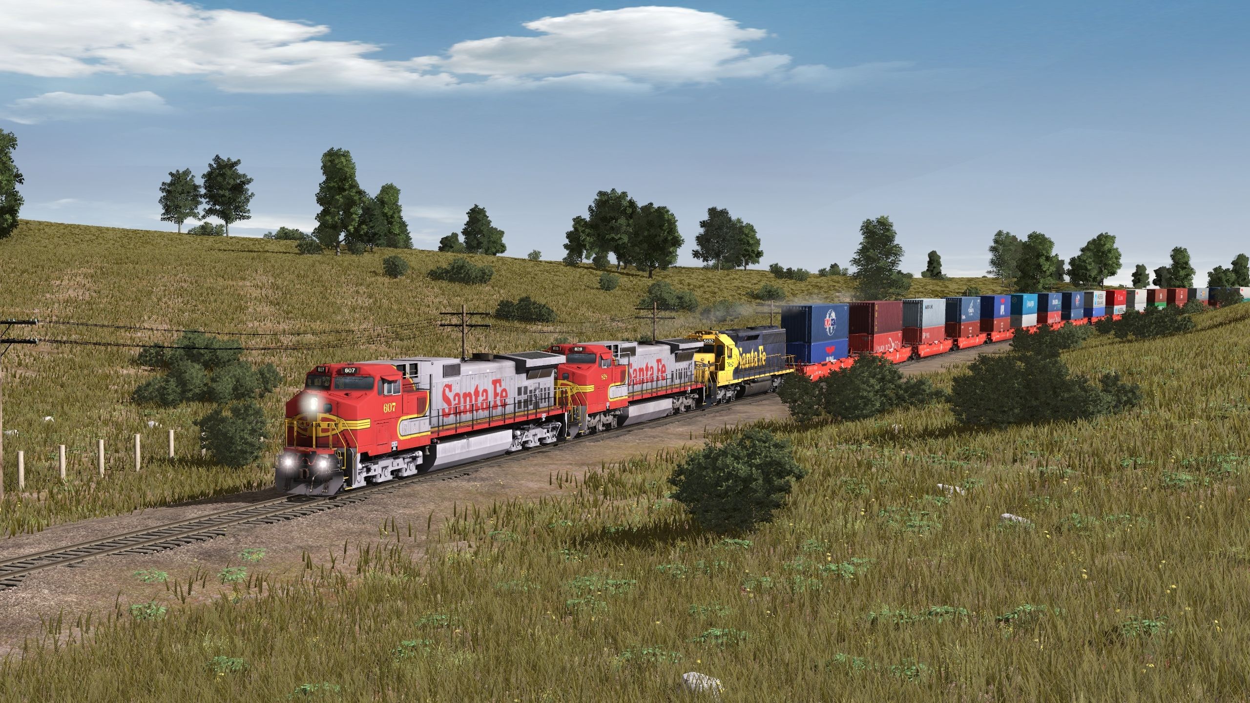 Posted by: epa | Posted:2019-11-05 22:24:21 Caption: Tags: Trainz Railroad Simulator 2019, Heart of Illinois, ATSF C44-9W, ATSF C40-8W, ATSF SD45-2 blue/yellow warbonnet, ATSF 48 Husky Stack